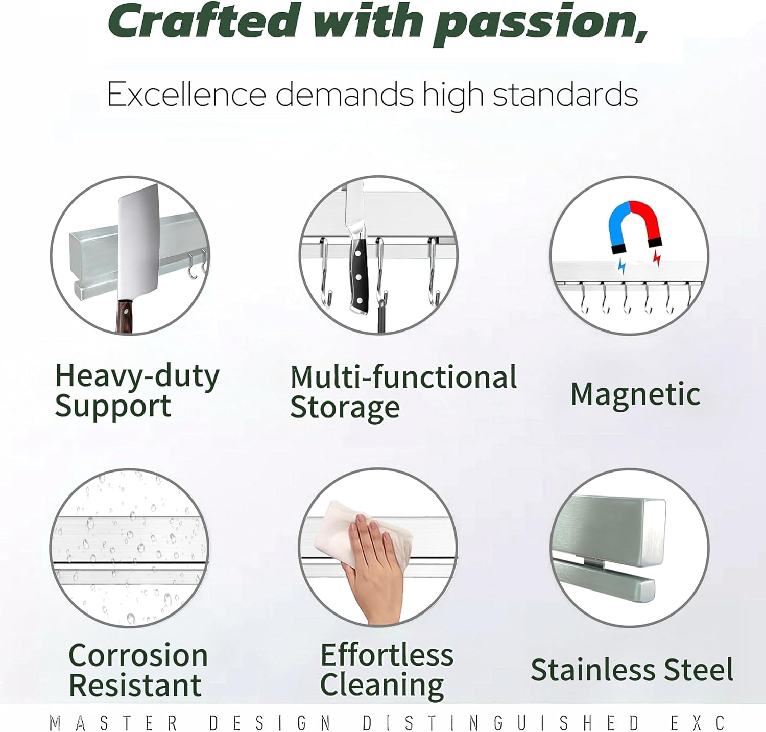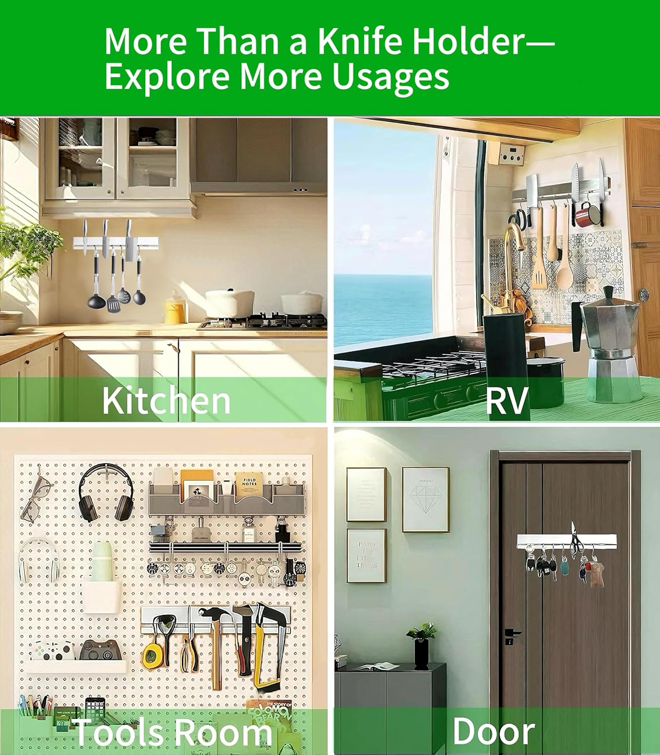 - 【Powerful Neodymium Bar Magnets & Reliable Strength】This stainless steel magnetic knife holder uses heavy duty magnets to reliably hold kitchen knives, utensils, and tools. The magnetic knife holder ensures your items remain firmly attached without slipping or weakening over time.