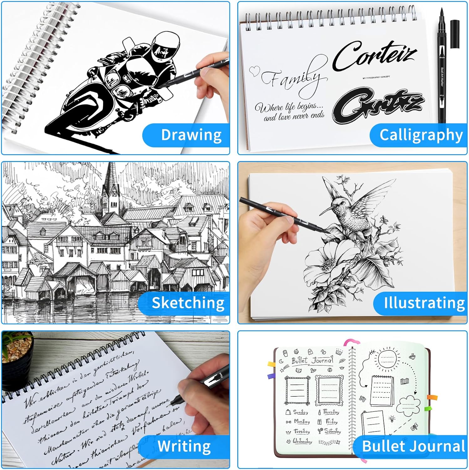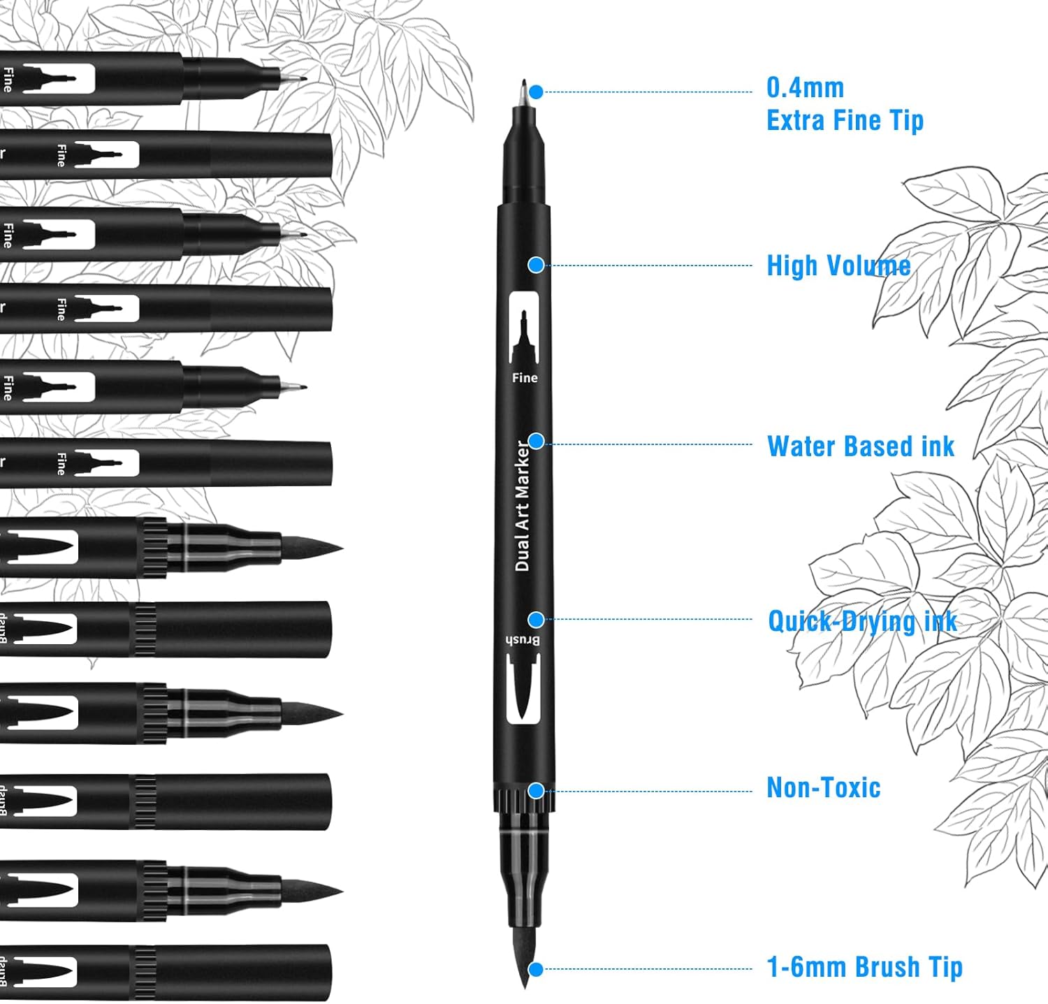 - Dual-Tip Versatility - Each marker features a precise 0.4mm fine tip for detailing/outlining and a flexible 1-6mm brush tip for shading/coloring. Perfect for sketching, hand lettering, bullet journals, and calligraphy