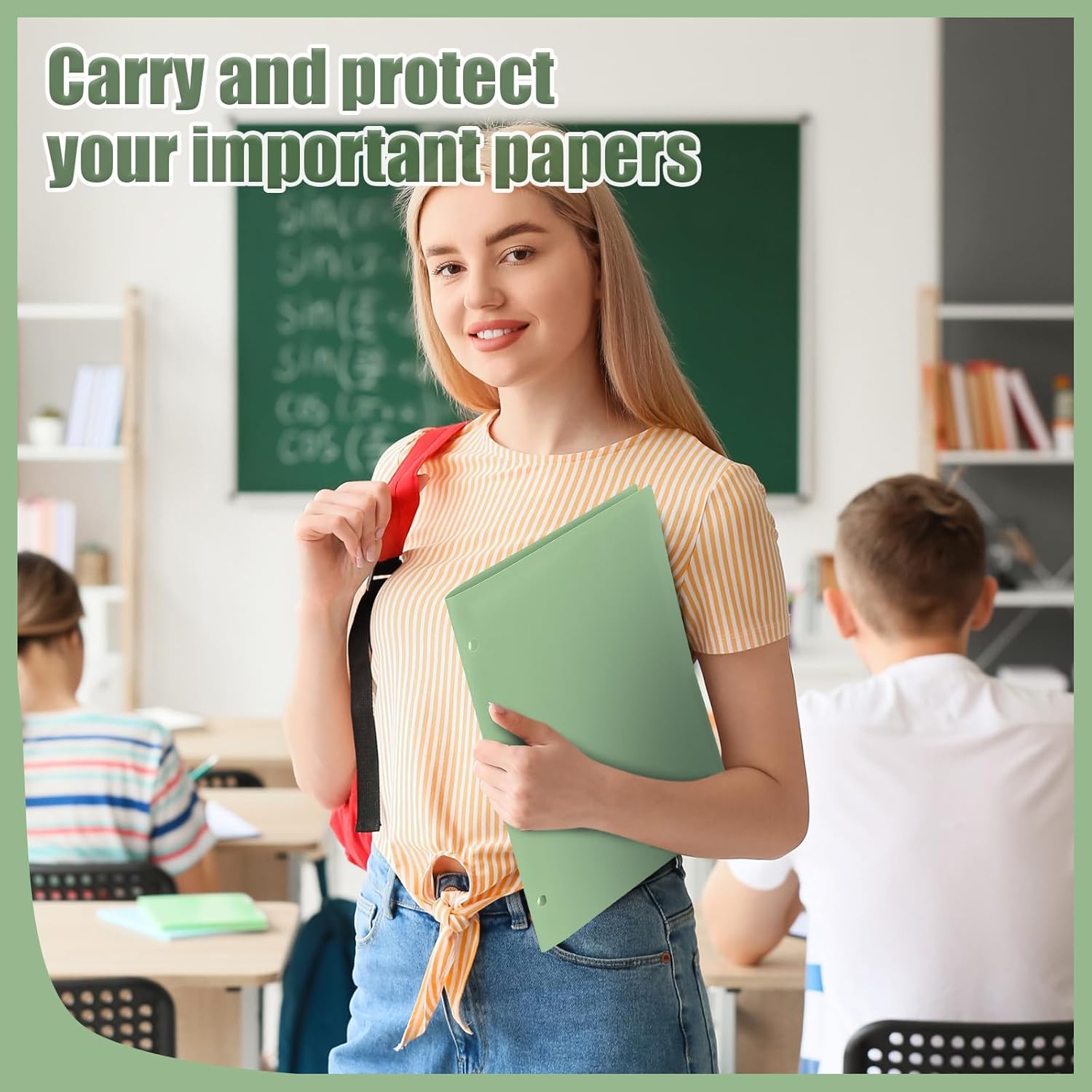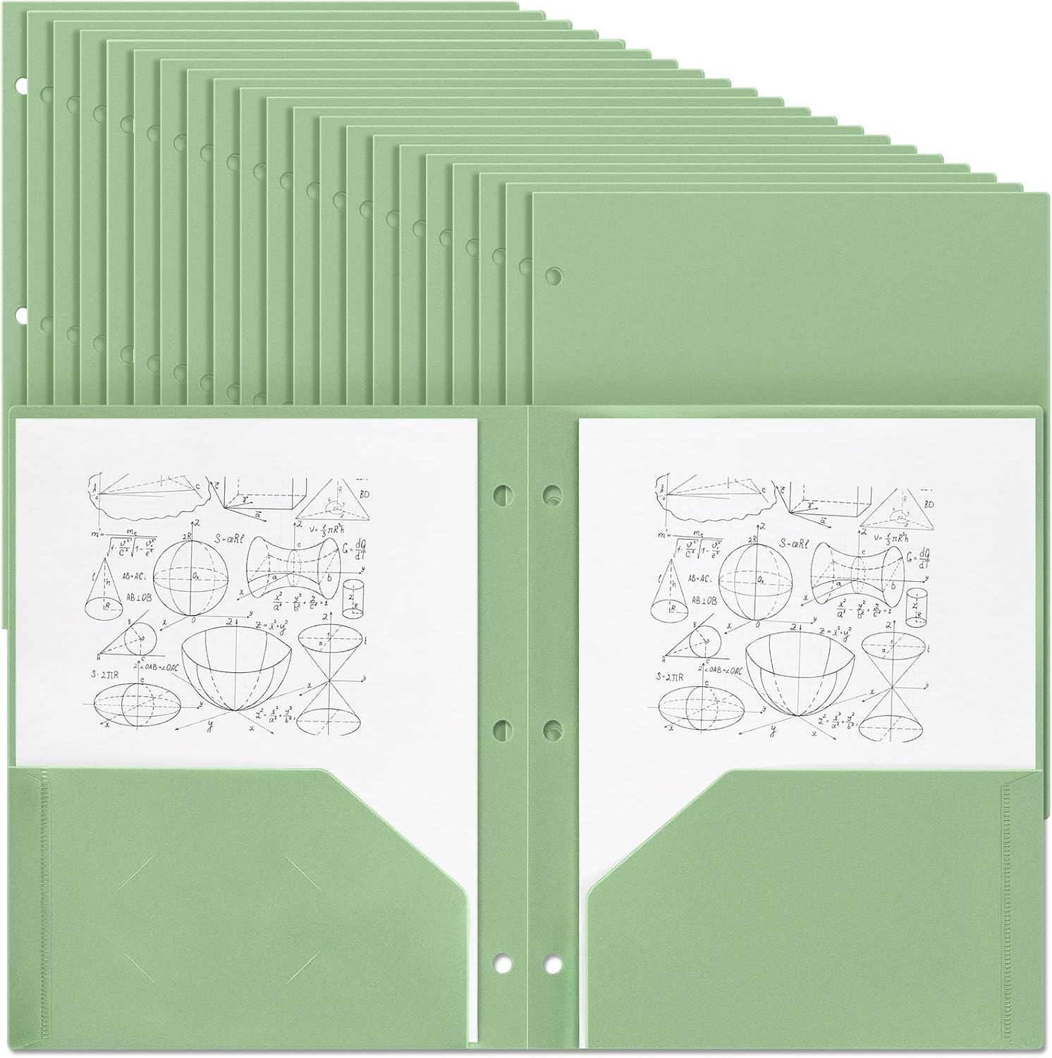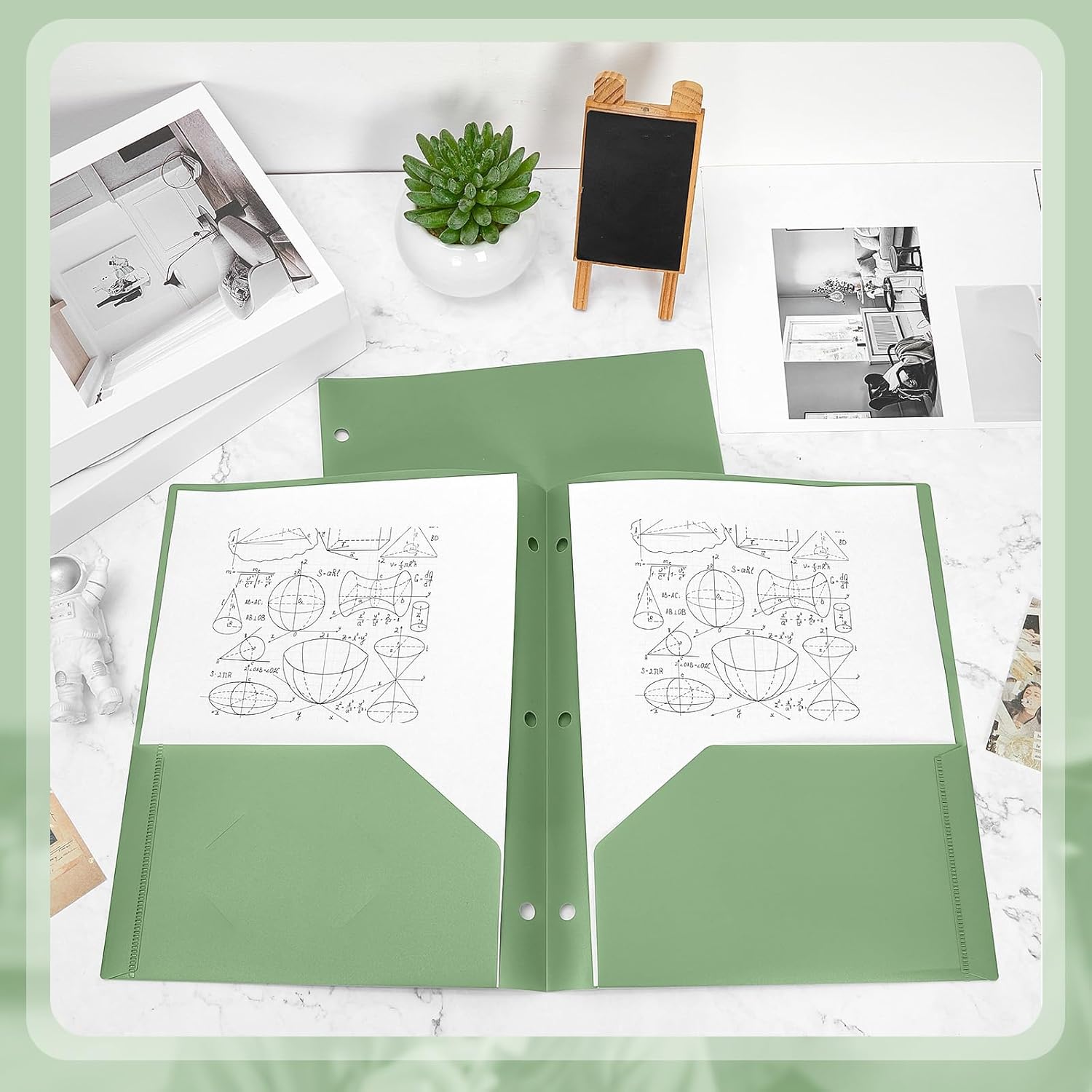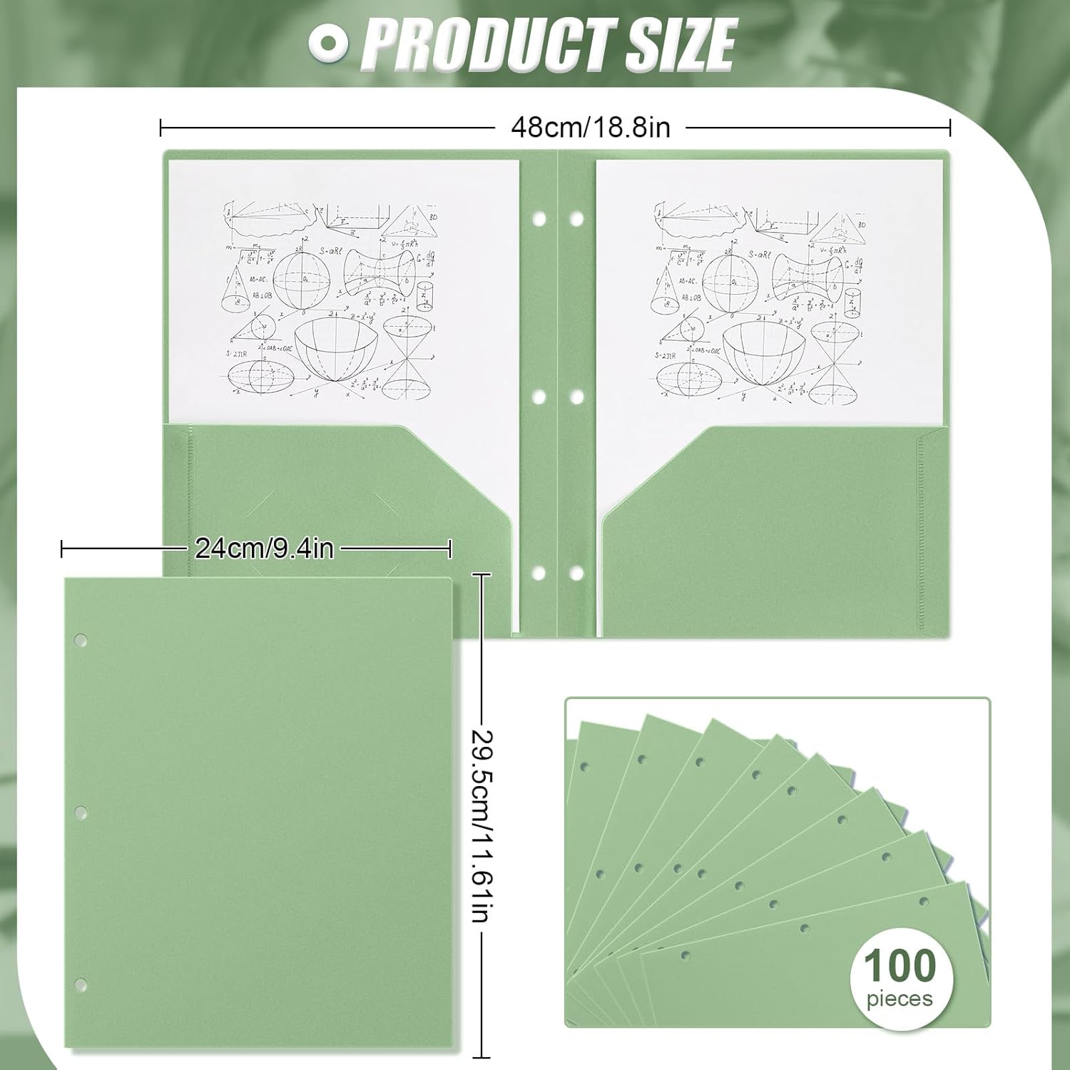 Yeaqee 100 Pcs Plastic Folders with Pockets Bulk 3 Hole Punched 2 Pocket File Folders for 3 Ring Binder Divider Folder for Notebooks, Durable Poly for Office Home (Sage Green)
