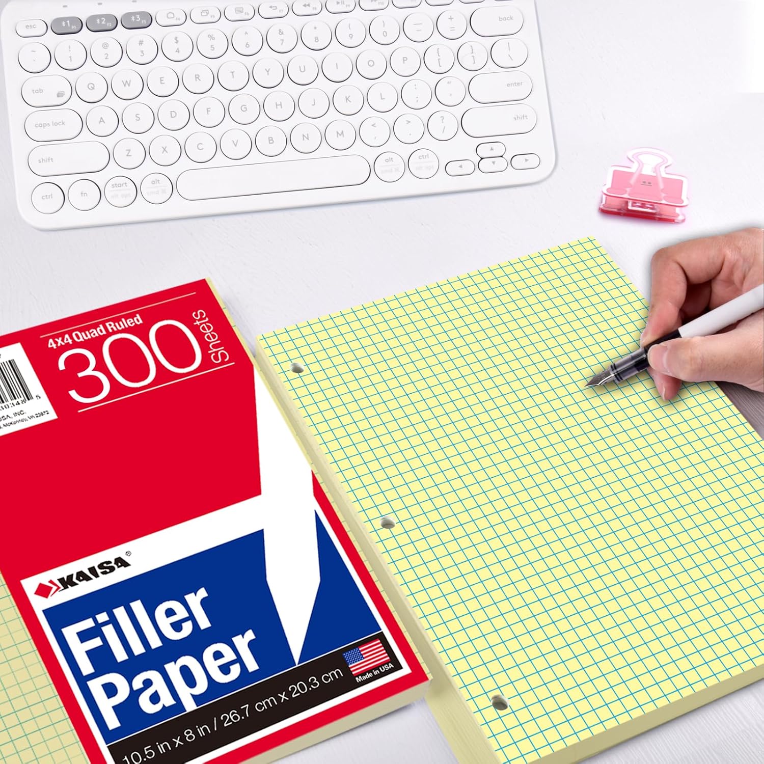 KAISA Loose Leaf Notebook Paper, 4x4 Quad Graph Ruled, 300 Sheets Per Lined Paper, 8" x 10.5", 3 Hole Punched for 3 Ring Binder, Canary, Made In USA