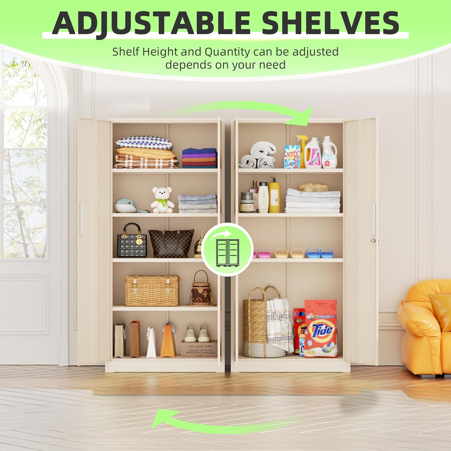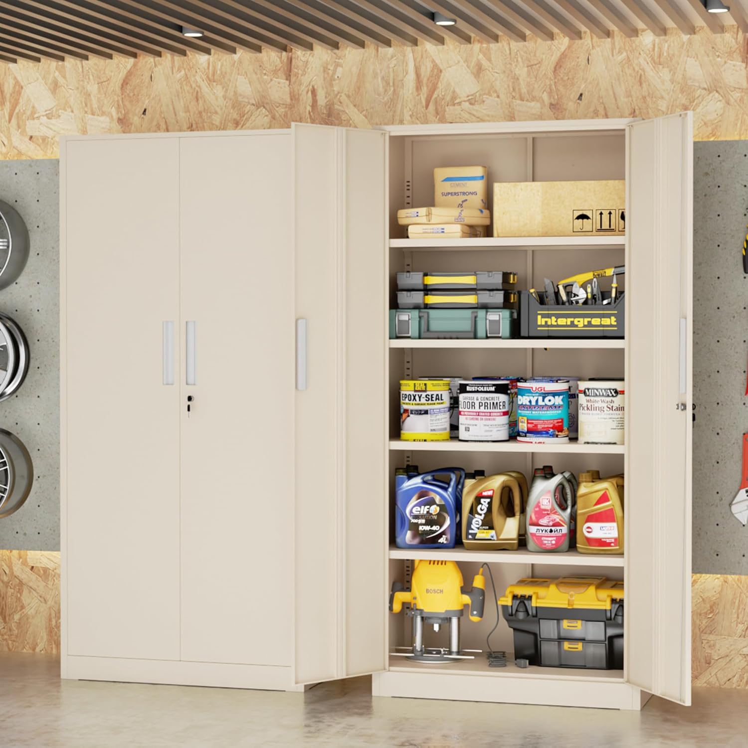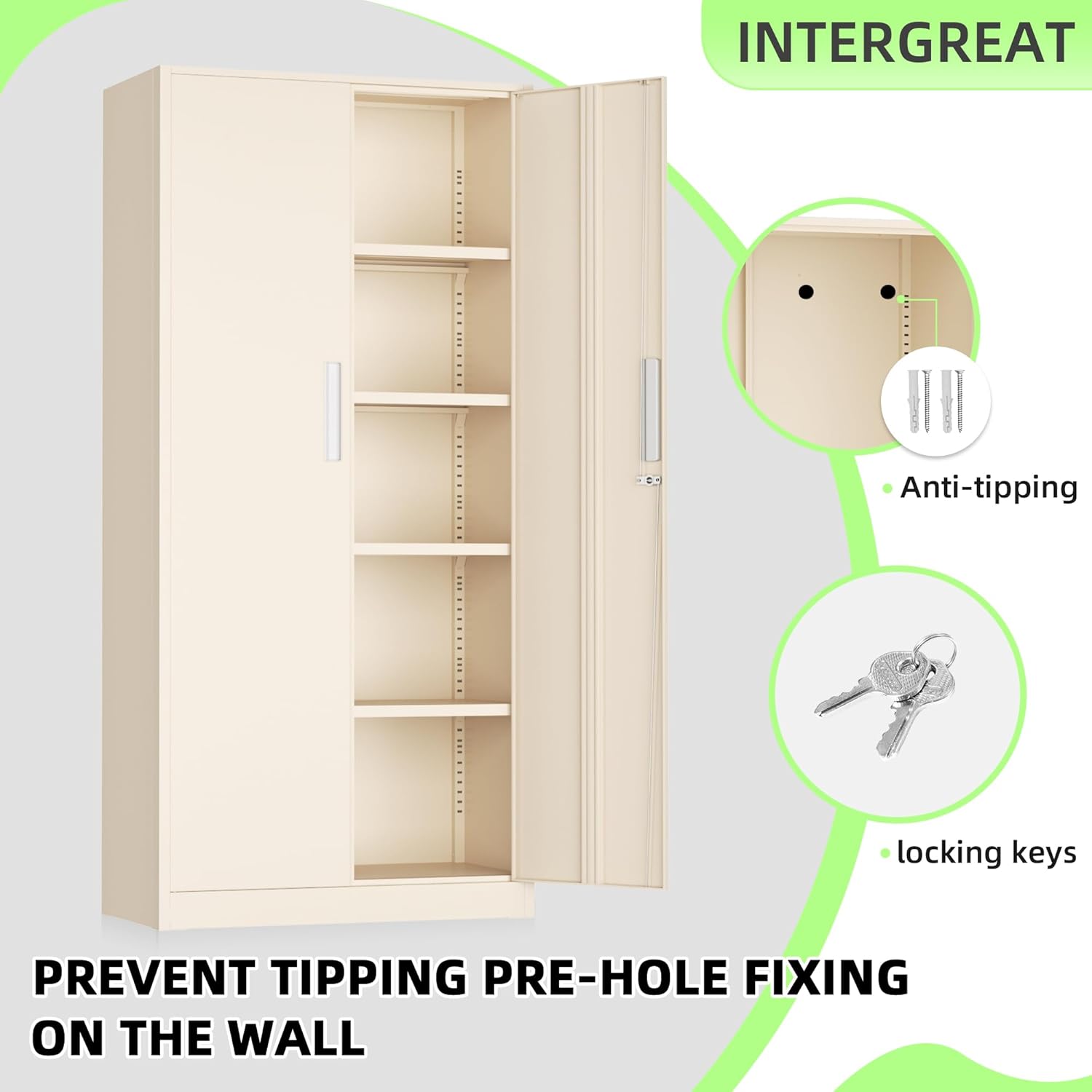 - 『4 Adjustable Shelves』: Tall storage cabinets with 4 adjustable shelves and 2 door to accommodate items of all sizes. Garage cabinets and storage system with lock picking to secure valuables, with two keys.