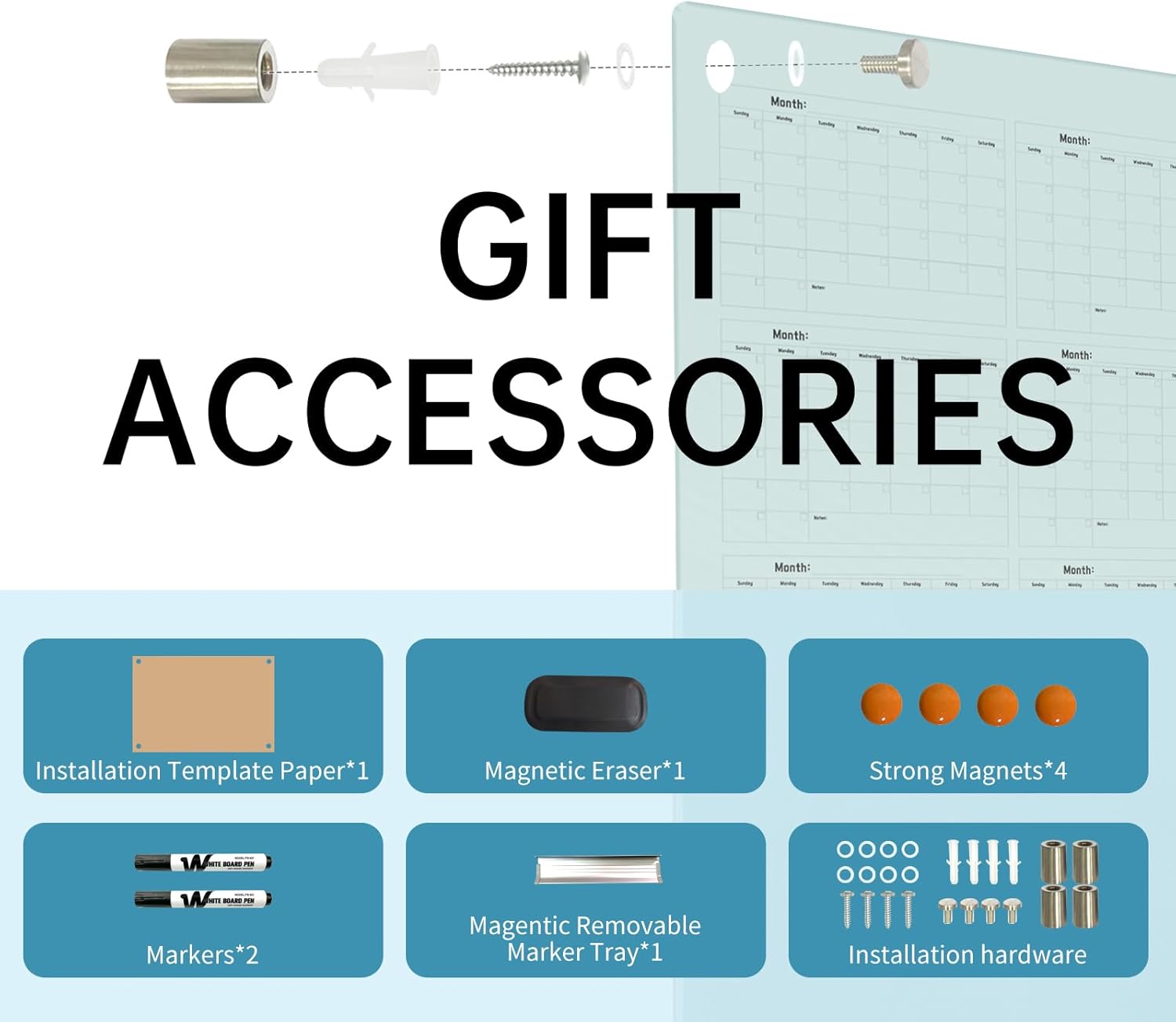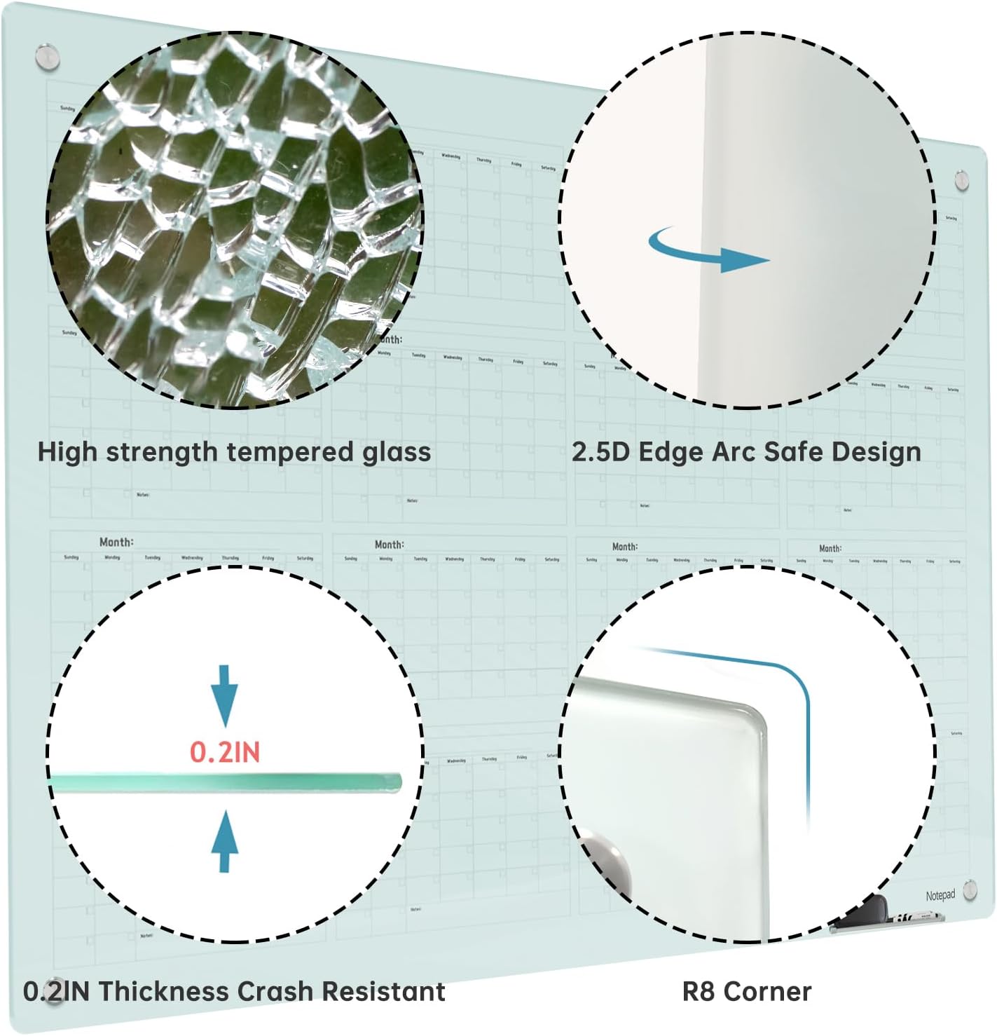 Magnetic Glass Dry Erase Board Calendar- White Board 48 x 36 Inch Wall Mounted Yearly Whiteboard, Large Frameless Glass White Board for Wall Office, Home & School