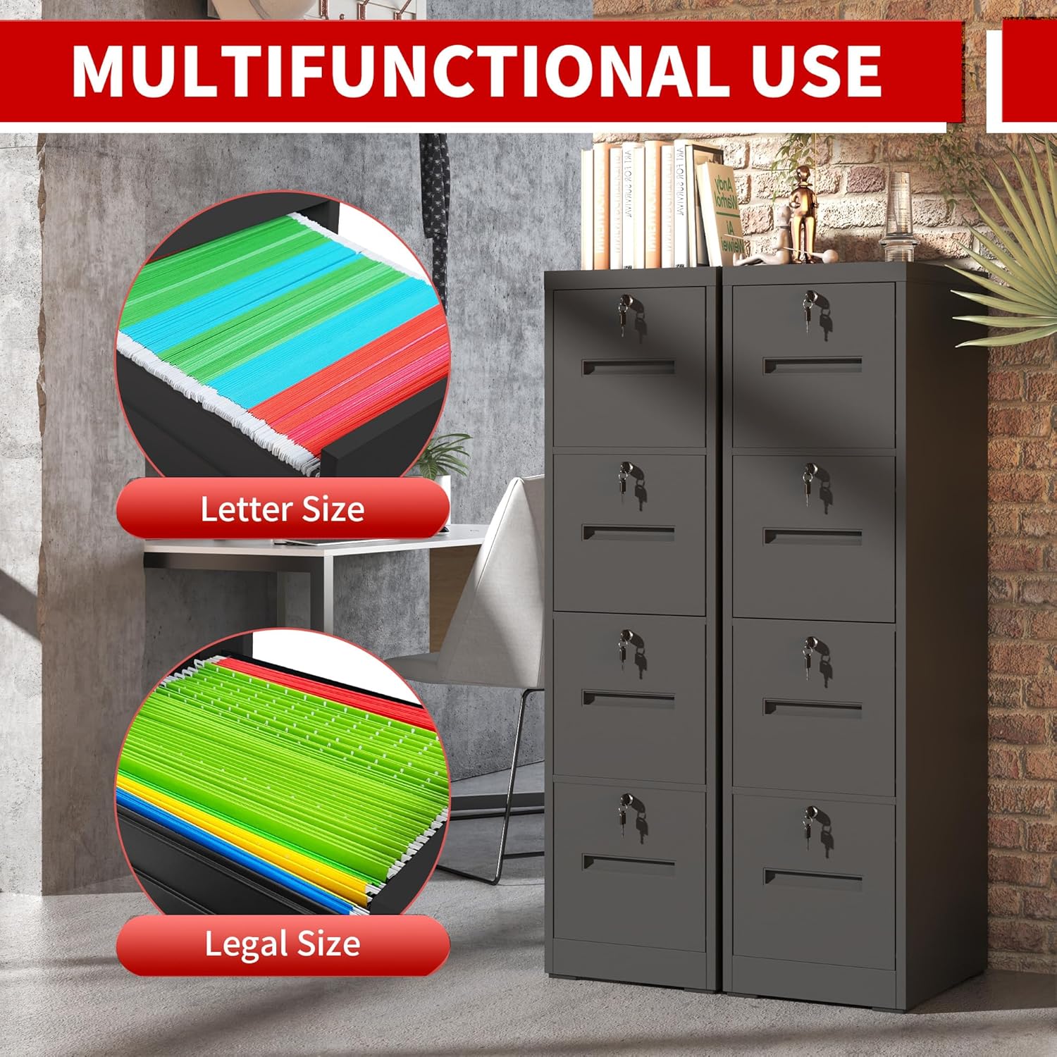 - Locking Cabinet: This 4 drawer filing cabinet prioritizes privacy and security, featuring a dedicated lock for each drawer. You can securely store different types of documents or restrict access to specific drawers as needed—giving you flexible, customizable security to match your organizational needs