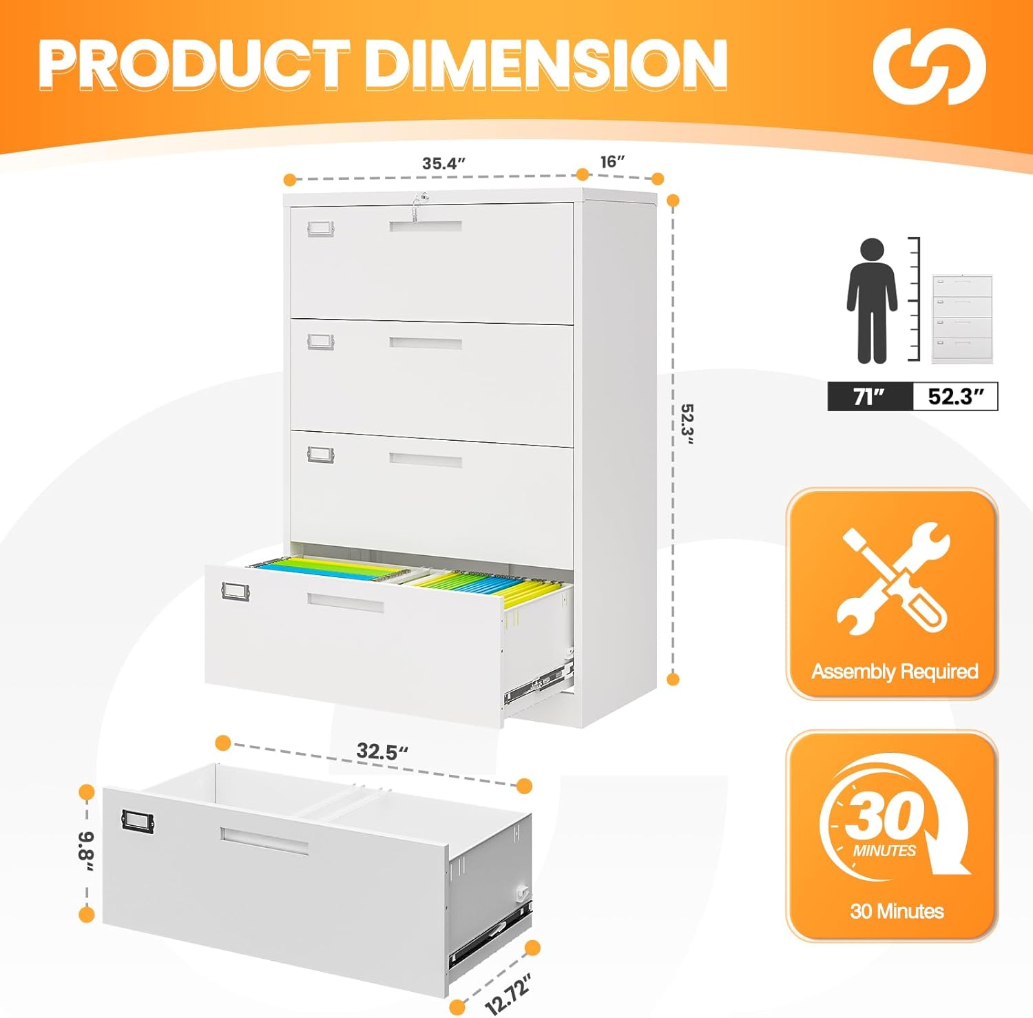 4 Drawer File Cabinets for Home Office, Metal Filing Cabinet with Lock, White Locking File Caninet Four Drawer, Office Storage Caninets Steel Cabnet for Letter/Legal/A4/F4-Assembly Required