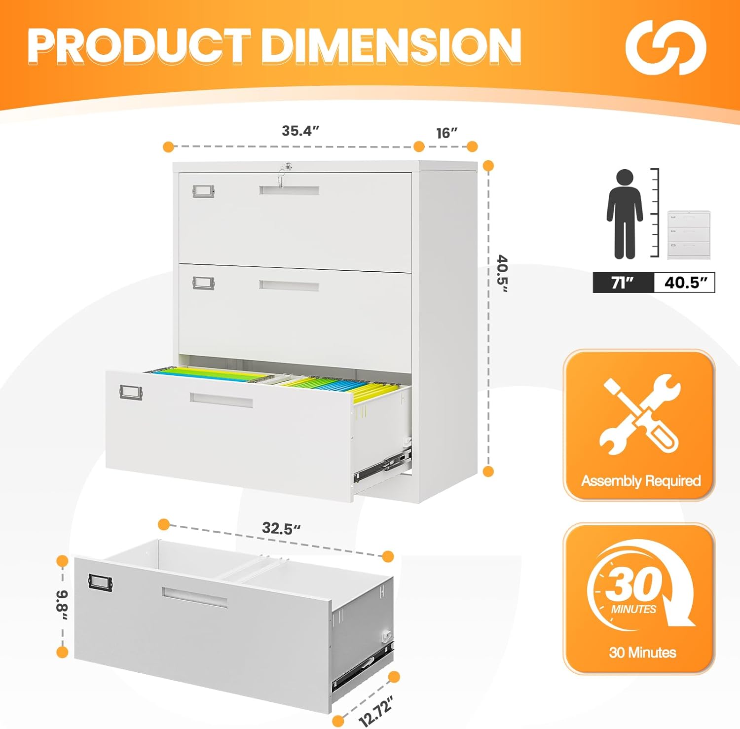 3 Drawer File Cabinets for Home Office, Metal Filing Cabinet with Lock, White Locking File Caninet Three Drawer, Office Storage Caninets Steel Cabnet for Letter/Legal/A4/F4-Assembly Required