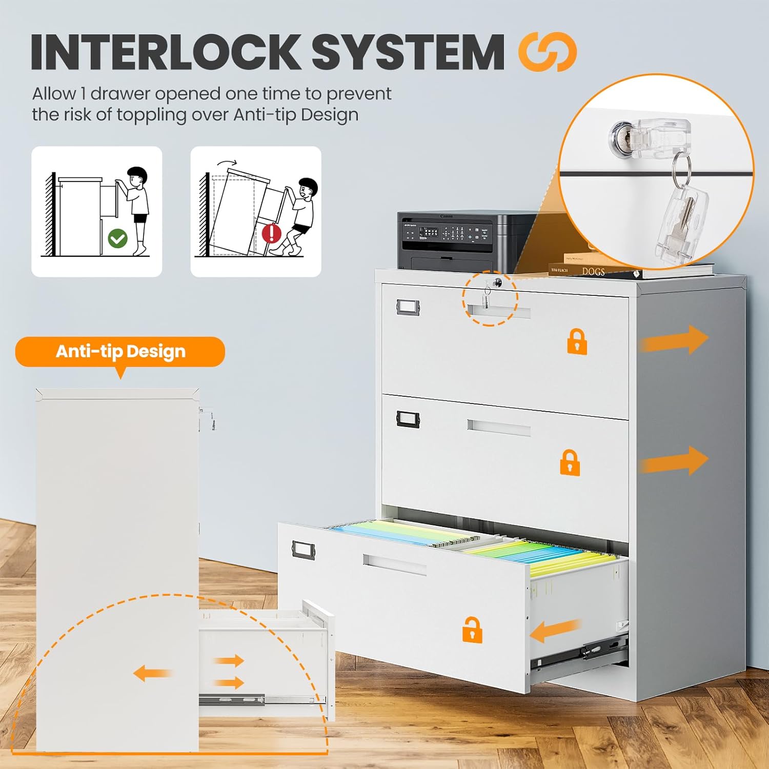 - 【Security Locking System】 ▶AFAIF locking file cabinet has a security and safety lock system, one lock can lock all drawers. When one of the drawers has been opened, the interlocking drawer system prevents the other drawer from opening, which prevents tipping and it come with 2 keys for your backup using. This modern lateral filing cabinet with locks, can help you keep your valuables and documents safe, such as contracts, receipts, cards, certificates, meeting materials, passports etc.