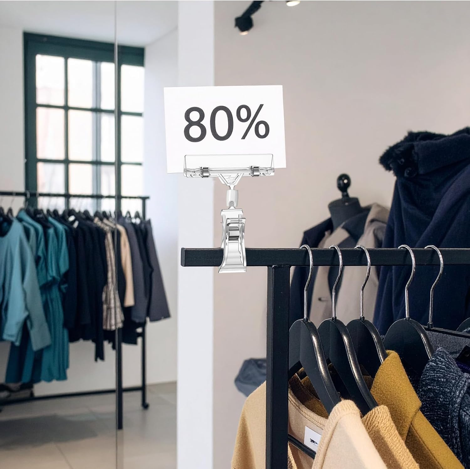 - Reassuring Quality of Details: Our sign holder clips are made of high-quality durable acrylic plastic material that is reusable, reliable, durable, clean, and adjustable. These sale sign holder clips for clothing rack rotatable design allow you to adjust the angle for optimal visibility, which can firmly fix label signs to 90Β° tilt or 360Β° rotate the sign in any direction you want to display. Ensuring your customers can easily view pricing and product information.