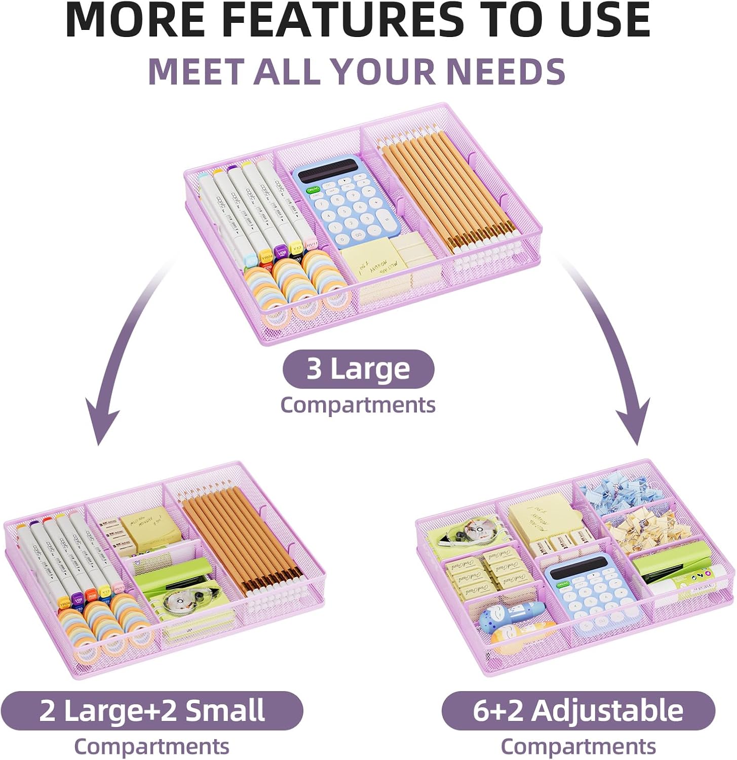 - Adjustable Dividers: The 5 adjustable dividers can be combined to fit variously sized desk accessories, such as pens, erasers, highlighters, notes, staplers, tapes, clips, or other supplies. Large Drawer: 12 x 8.5 x 1.8 inches. Medium Drawers: 4.5 x 3.8 x 1.8 inches, Small Drawers: 4 x 3 x 1.8 inches.