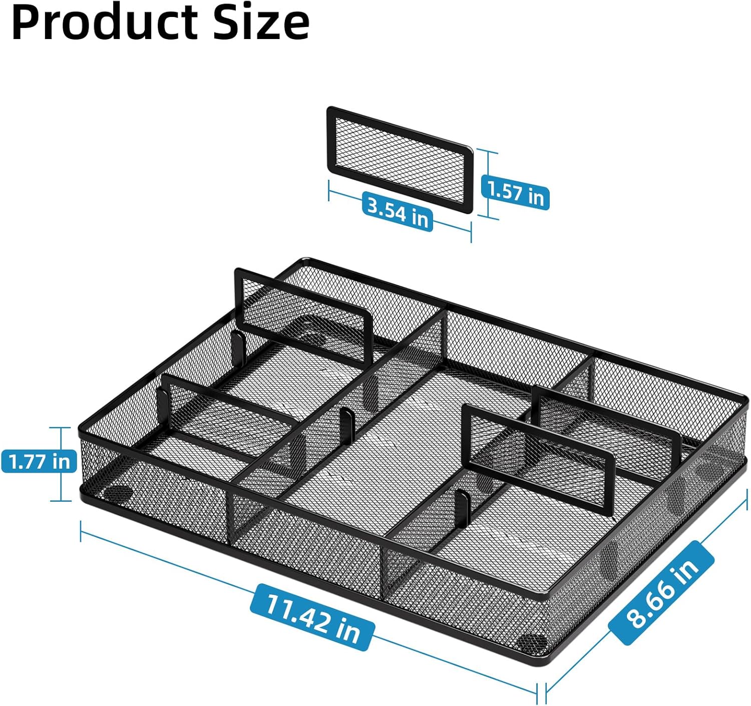Marbrasse Desk Drawer Organizer, Metal Mesh Drawer Organizer Tray with 5 Adjustable Compartments,Desk Organizers and Accessories for Home,Office,Kitchen,Makeup,Vanity (Black)