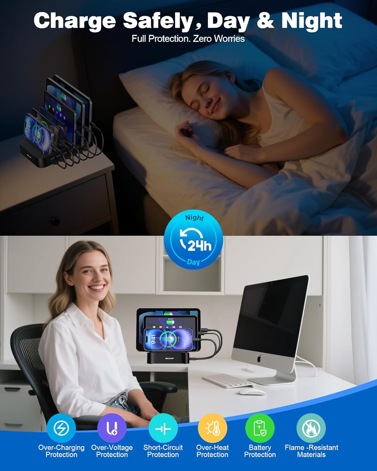 - ăSafety-First Design - For Worry-Free, Everyday ChargingăCrafted with a flame-retardant ABS casing and soft anti-slip pads, this Phone charging station delivers stable, secure charging day after day. Built-in safeguards protected your devices from overheating, overvoltage, overcharge, and short circuits - 24/7. A dedicated power switch gives you quick, safe control. From busy homes to office desks, every detail is made to make charging safer and more dependable.