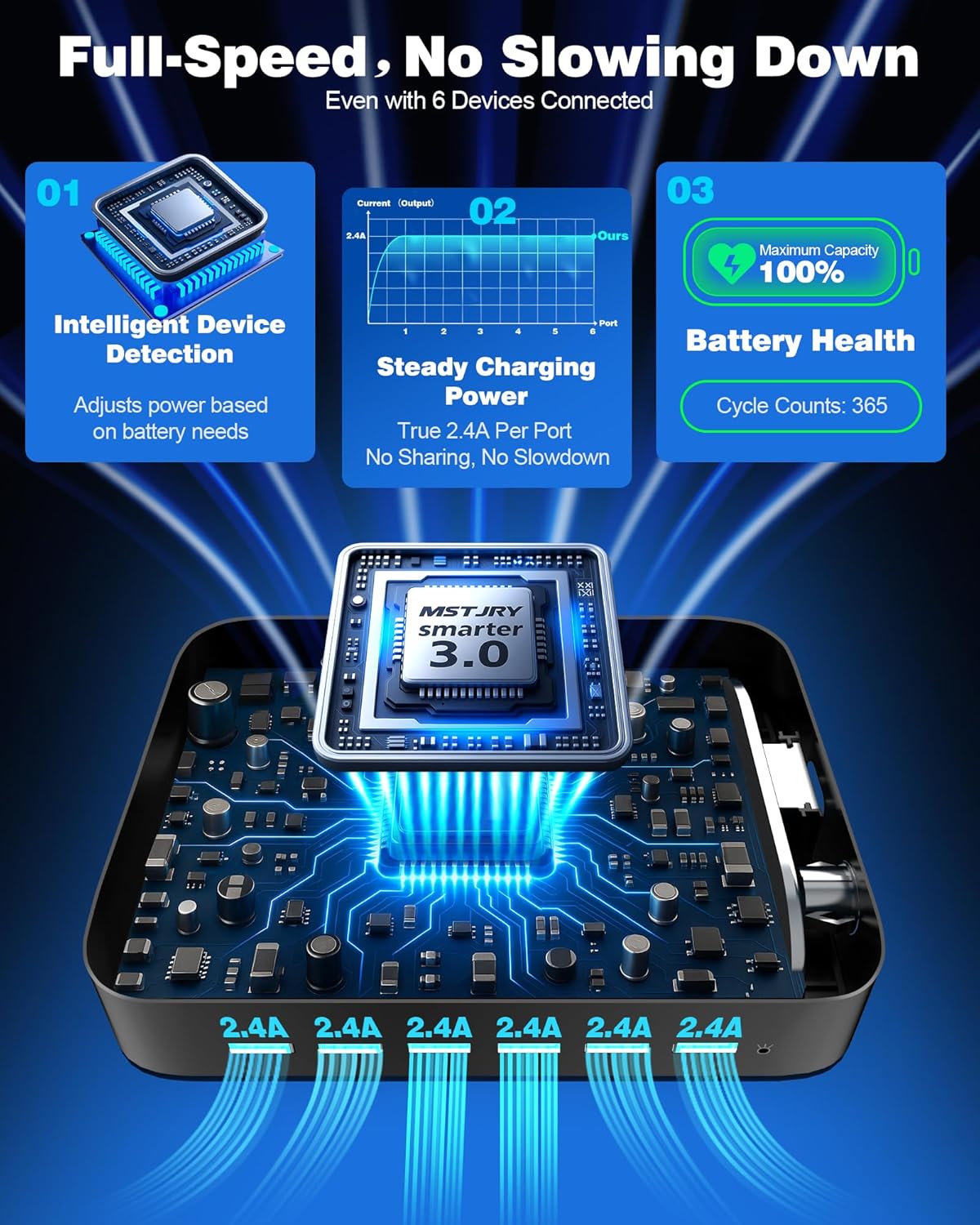 - ăFull-Speed Charging, Even with 6 Devices - Powered by Smart Chip ăNo more slowdowns just because you're charging more. MSTJRYâs advanced Smart-chip ensures every device gets a full stable 2.4A output - whether you're charging one phone or powering a whole family's devices at once. It intelligently adapts to each battery's needs, helping protect battery life while keeping charging fast and steady. One charging dock, always fast, always steady - no matter how many devices.