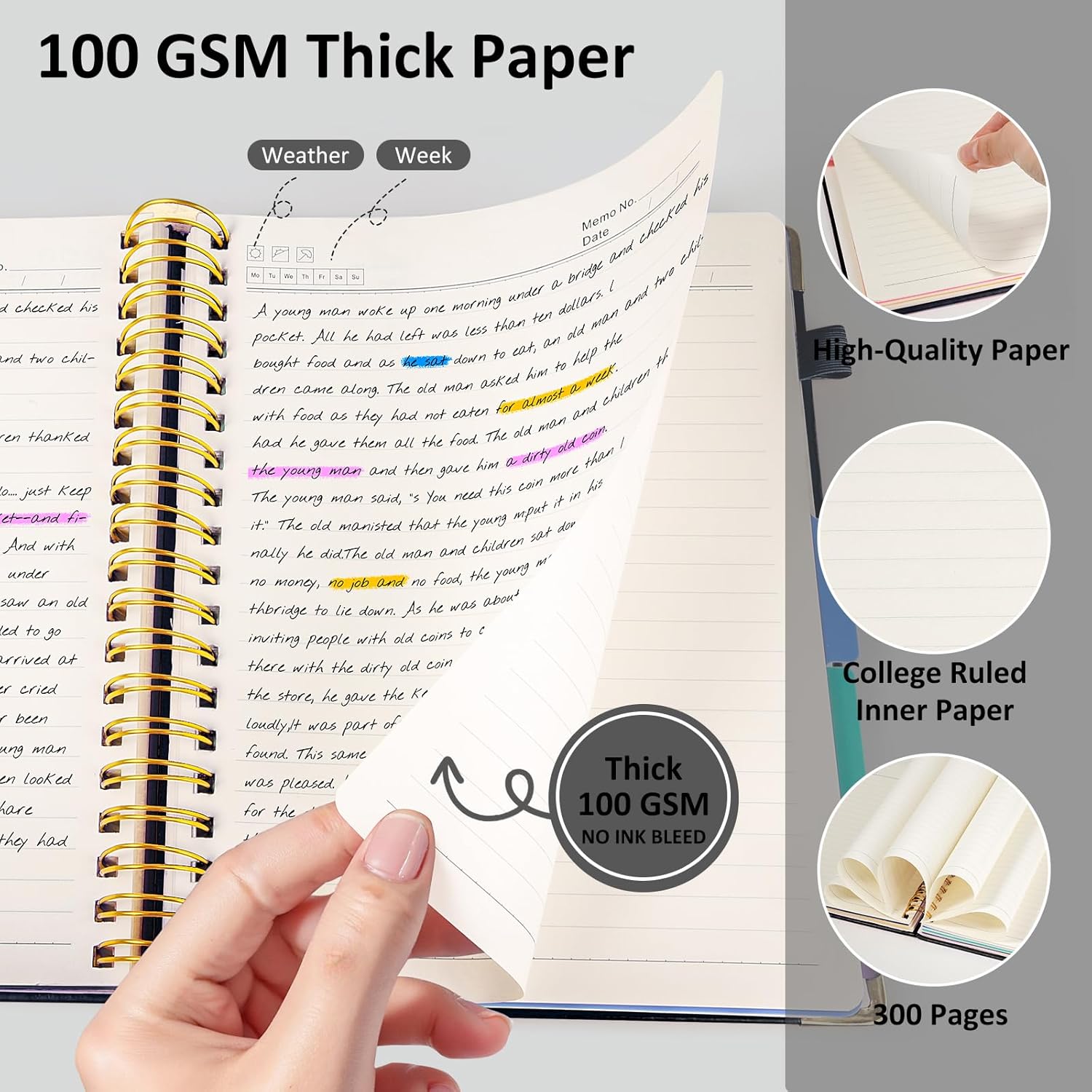 - 300 Pages &100 GSM Thick Notebook Journal: This large B5 notebook 8"x10" provides generous 300 pages /50 sheets for long-term use, reducing the need for multiple notebooks. Features high-quality 100 GSM thick, acid-free, ivory paper that prevents ink bleed-through and ghosting, ensures a smooth writing experience, and is gentle on eyes with 7mm college ruled lines. Works great with all pen types.