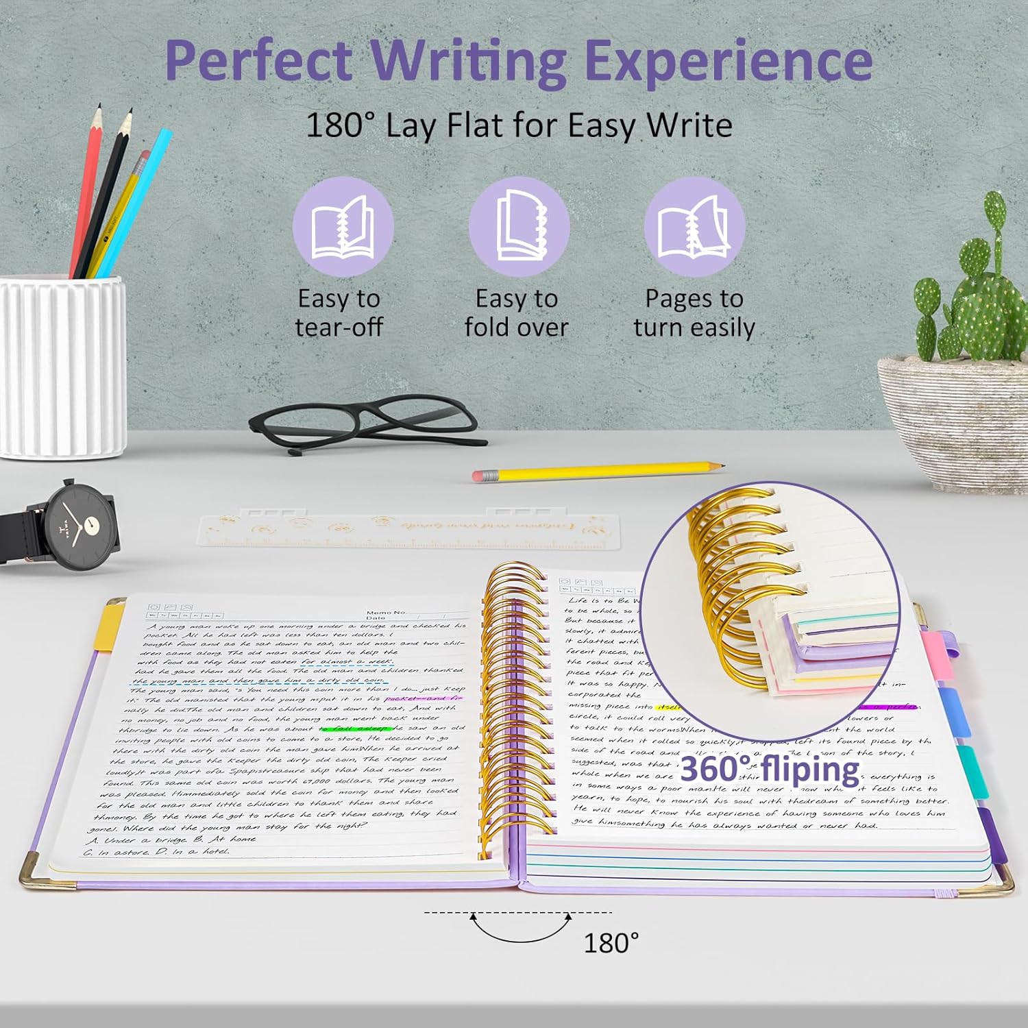 Hardcover Spiral Notebook Journal, 8"x10" Large B5 Notebooks with Removable Dividers Tabs, 300 Pages Leather 5 Subject Notebook College Ruled, Journal for Work School Note, 100 GSM Thick Paper,Purple.