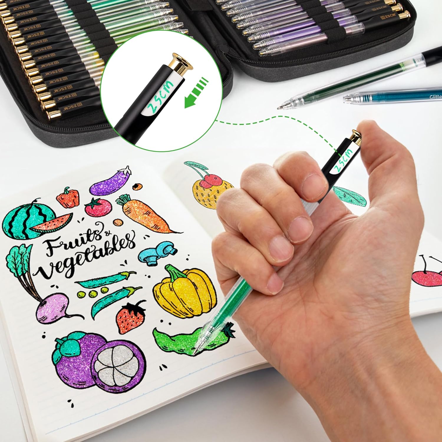 - 72 Premium Glitter Gel Pens - Complete Color Collection:Bring every creative vision to life with our ultimate 72-color glitter gel pen set, featuring 12 stunning shades in each of 6 vibrant color families: Pink, Yellow, Blue, Purple, Green, and Skin Tones. Each retractable pen has a smooth 1.0mm tip with rich glitter ink for perfect detailing and shading.From soft pastels to bold neons and natural tones, this comprehensive glitter pen collection covers all your artistic needs.