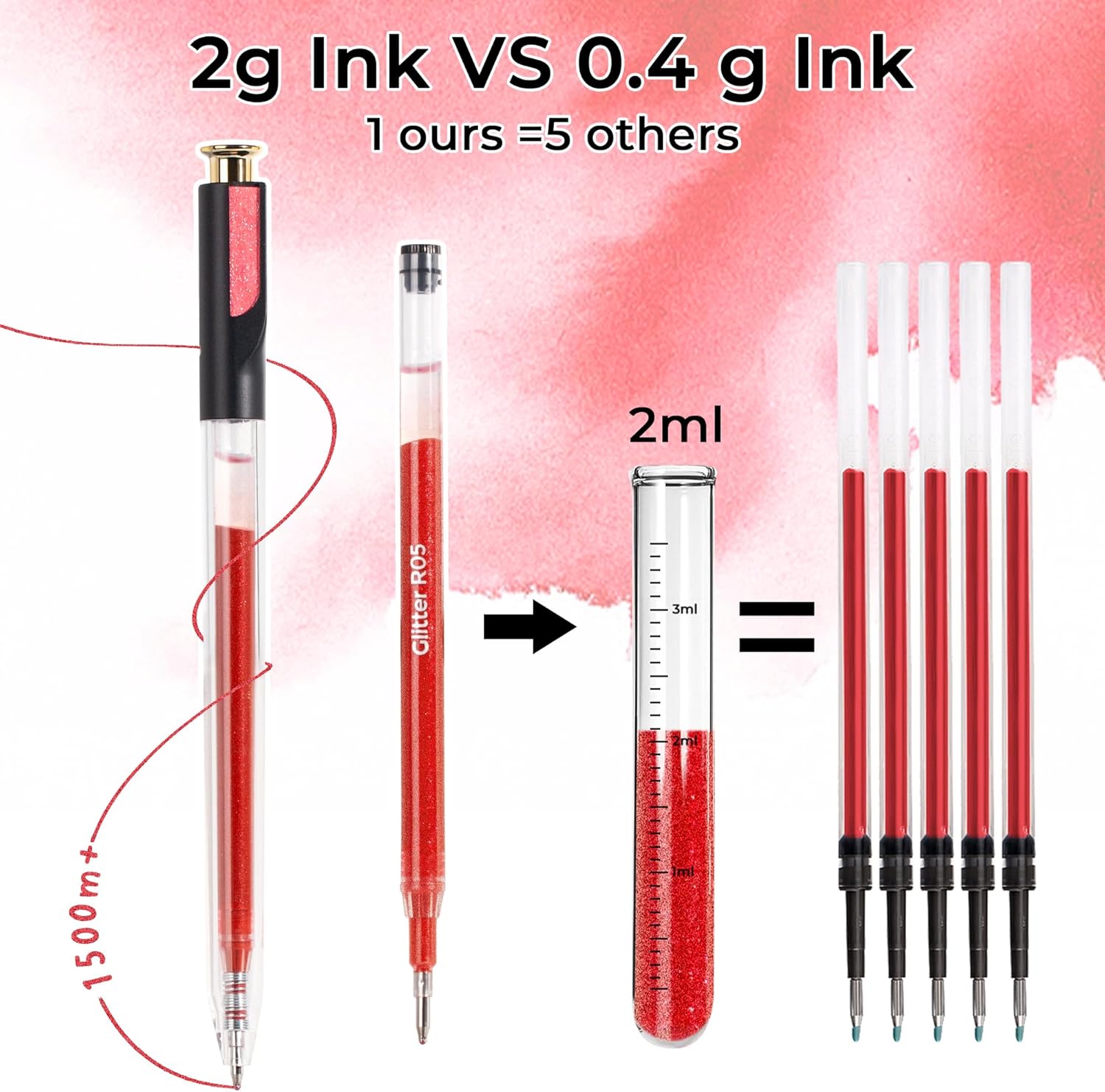 - 12 Stunning Pink Glitter Shades:The ZSCM Red Pink Retractable Glitter Gel Pen Set features 12 dreamy shades from soft ballet pink to bold magenta. With smooth retractable mechanism and 1.0mm precision tip, these retractable glitter pens deliver rich, sparkling ink perfect for wedding invitations, love journals and floral illustrations. The high-density glitter formula ensures vibrant color payoff every time.Light up your creativity!