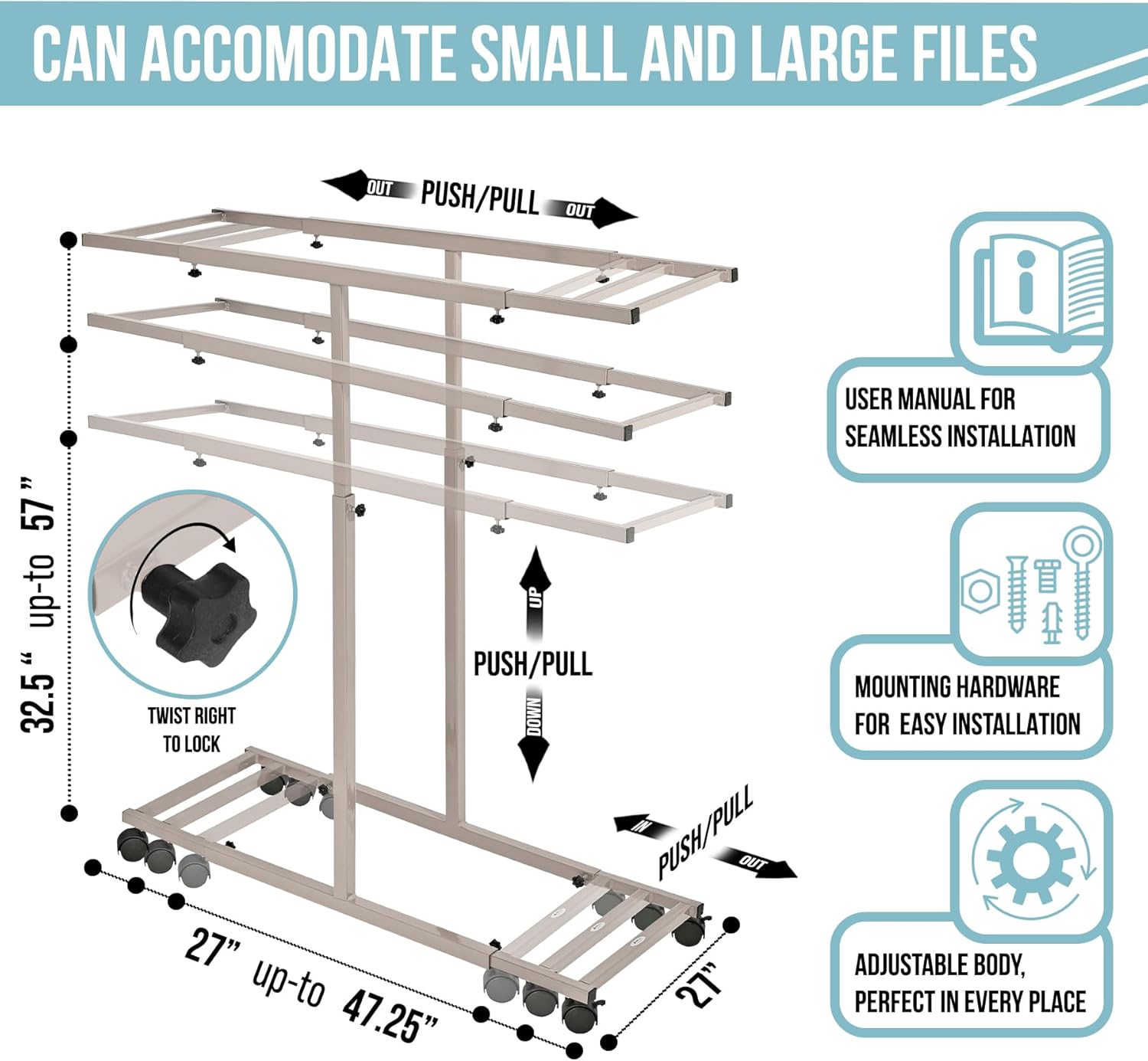 - Mobile and Adjustable Rack: The blueprint rack rolls smoothly on four casters, with front brakes for stability. Height and depth adjustments accommodate different file sizes, making it versatile for various office or job site needs.
