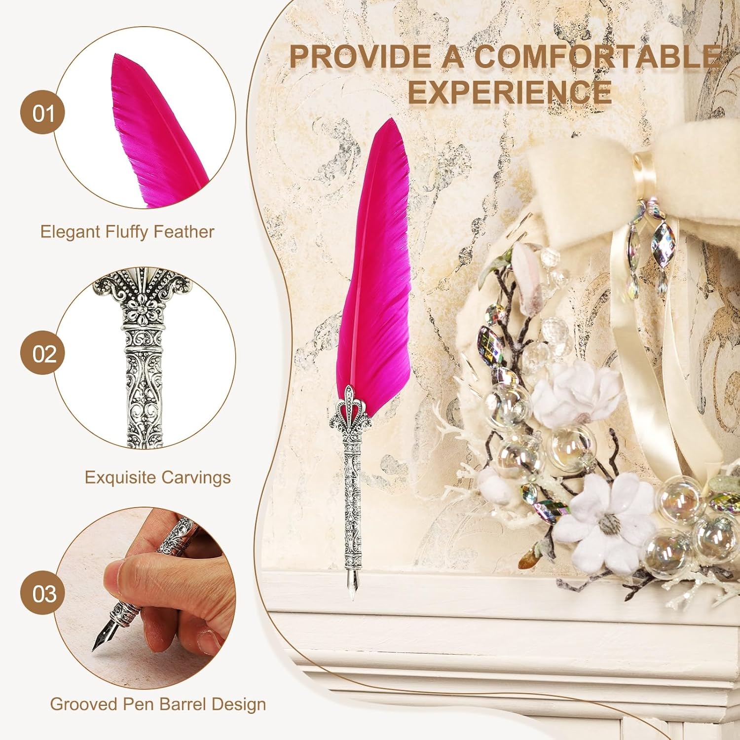 - Specifications: Color: Rose Red; Material: Metal, Feather; Pen length: 26.5 x 4.5cm / 10.4 x 1.8inch ( L * W ); Pen Diameter: 0.8cm / 0.3inch; Packing List: 1 x Calligraphy Feather Quill Pen, 5 x Replacement Nibs
