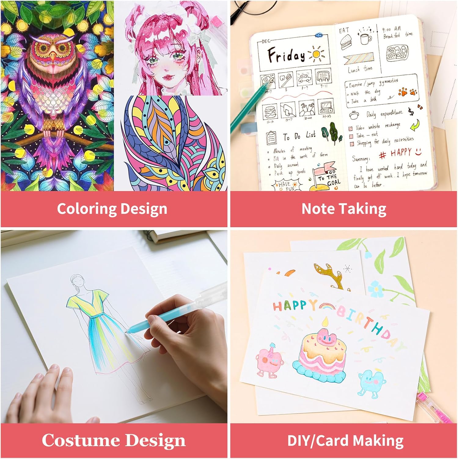 - 【 Multi-Purpose Usage】The gel pen set is an ideal art supply for adults and kids, perfect for coloring books, bullet journaling, sketching, drawing, writing, comics, and any other designs on Scrapbooks, School Projects, Party Invites, Greeting Cards, DIY Decor, Letters to Friends or Family.