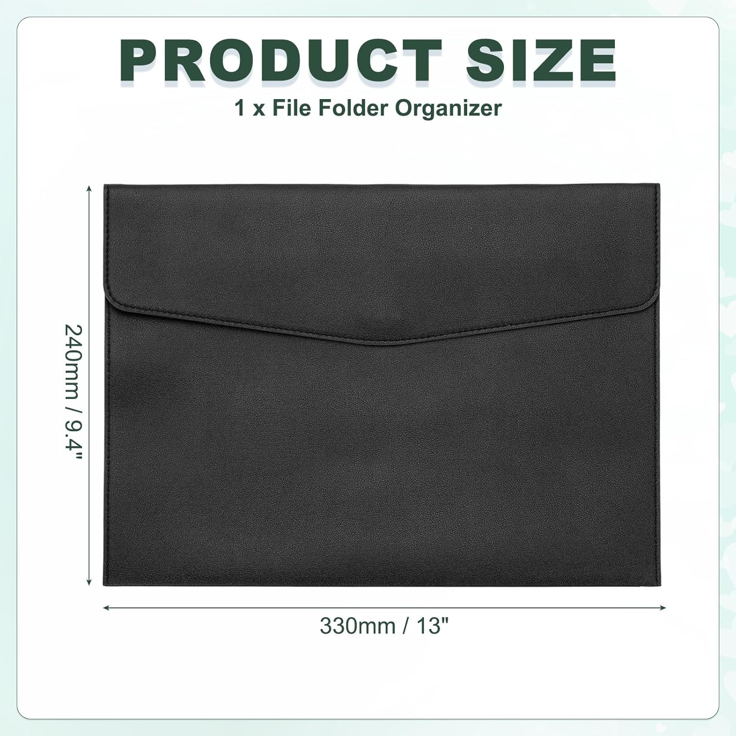 - Color: Black; Material: PU Leather; Size: 330 x 240mm / 13 x 9.4 inch(L*W); Packing List: 1 x File Folder Organizer