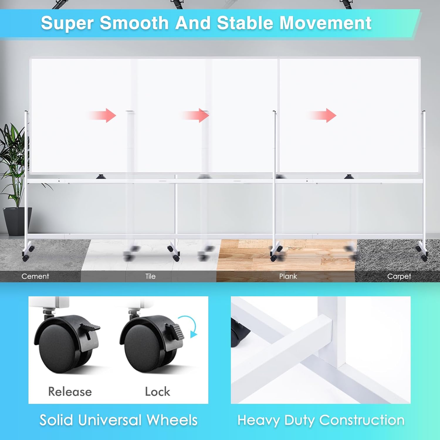 - Solid Construction & No-Wobble: The rolling whiteboard is crafted with the highest quality materials, including rust protective coating, strong ABS corners, and solid frame construction. All these make the whiteboard long-lasting and safer to use. The large white board is equipped with 4 universal wheels for easy moving on hard floors or carpets. It is fortified with casters with locking brakes, so the wheels can be locked, making it stable when writing and wiping