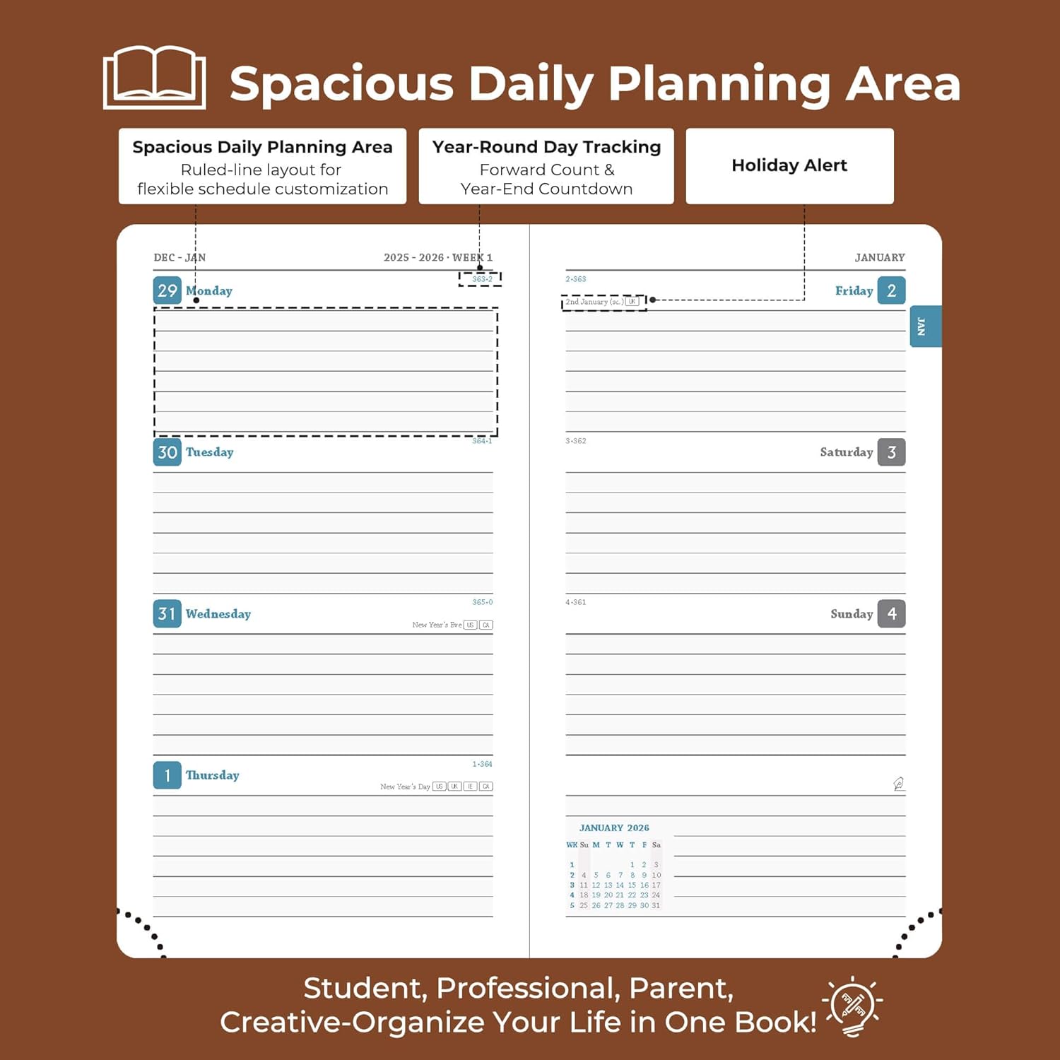 - Great Material for Weekly Planner: Crafted with FSC-100gsm thick paper that resists ink bleed and daily wear, this 2026 planner ensures smooth writing with markers while gentle on your eyes through its ivory white pages. The Vegan leather soft cover and reinforced lay-flat binding make it a calendar planner companion for busy professionals, students, and families