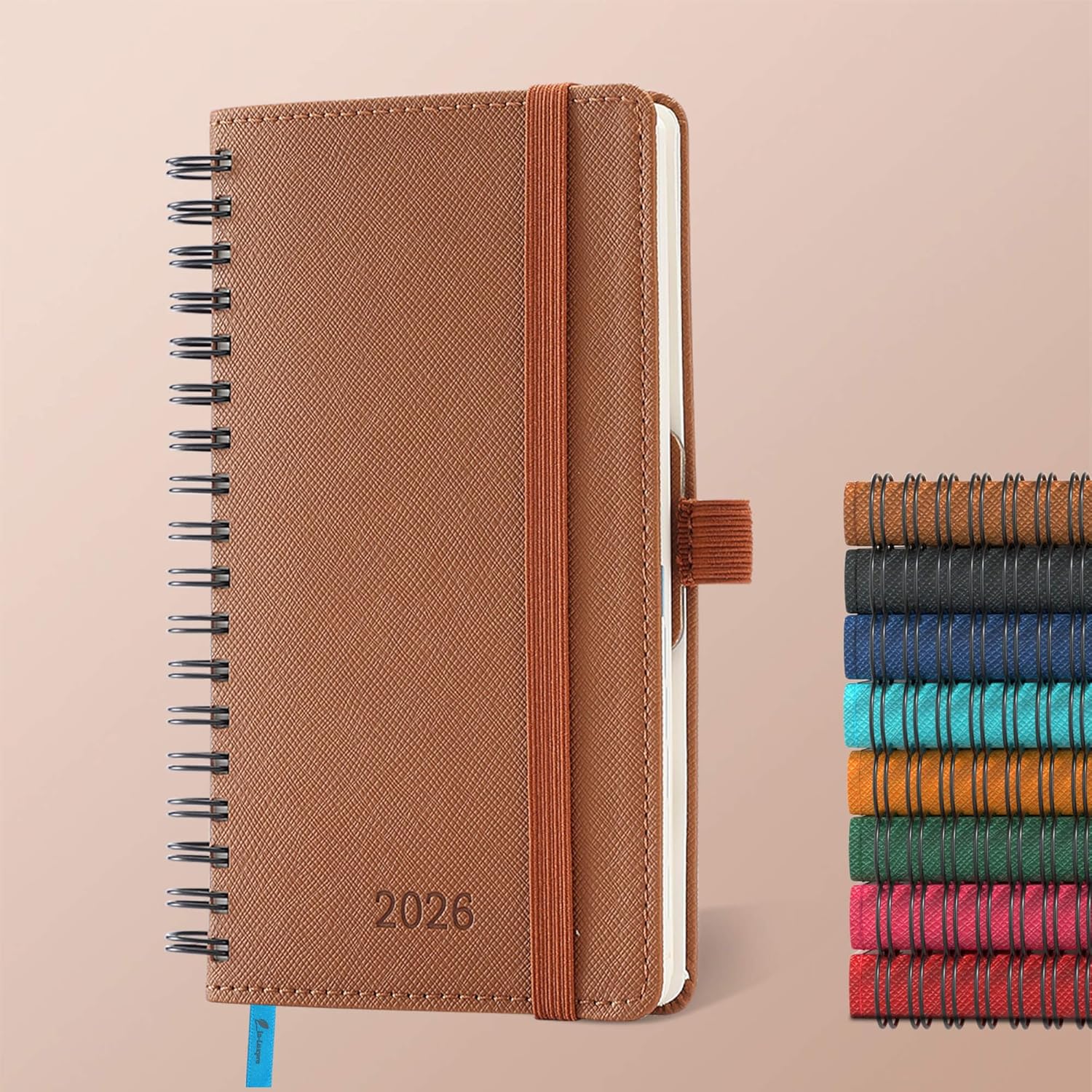 Planner 2026 Daily Weekly and Monthly,6.5"x3.75",12 Months Spiral Bound Calendar Agenda with Self-adhesive Pen Holder,2026 Appointment Book with Vegan Leather Soft Cover,Brown