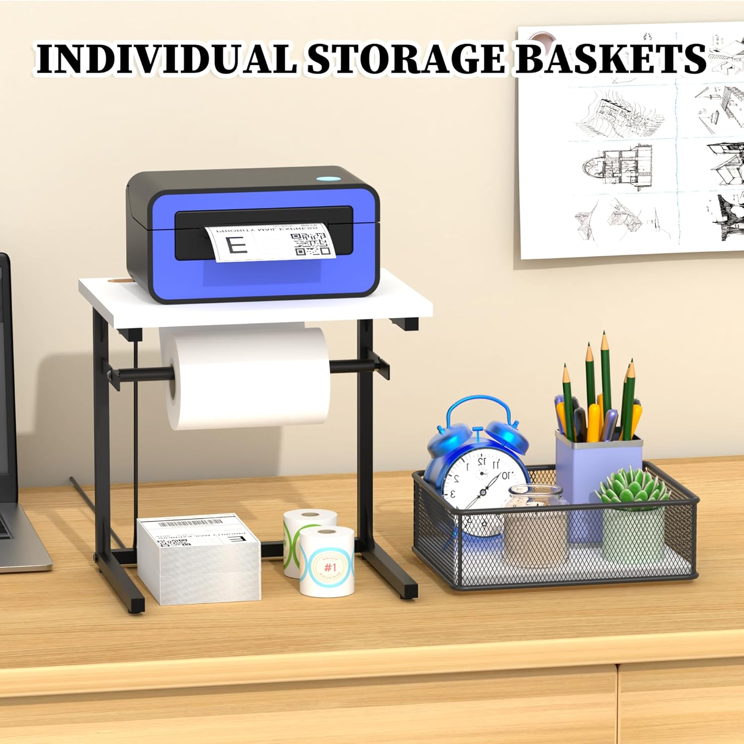 - ALL-IN-ONE DESIGN: Our label roll holder accommodates both thermal label printers and label rolls. The top shelf has holes on both sides to neatly hide the power cord. The bottom drawer is designed to be flexible, not only for storing printed labels, pens and other small items, but also for being pulled out and used individually as a desktop organizer for small office items