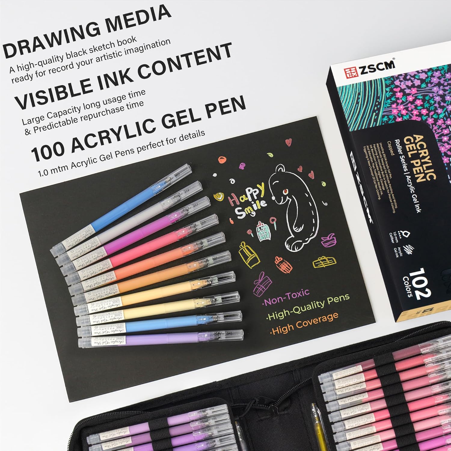 100 Colors 3D Acrylic Gel Pens & Black Paper Sketchbook for Drawing, 1mm Fine Point Acrylic Ink Pen, Opaque Archival Ink Pens for Black Paper Drawing, Sketching, Illustration, Card Making