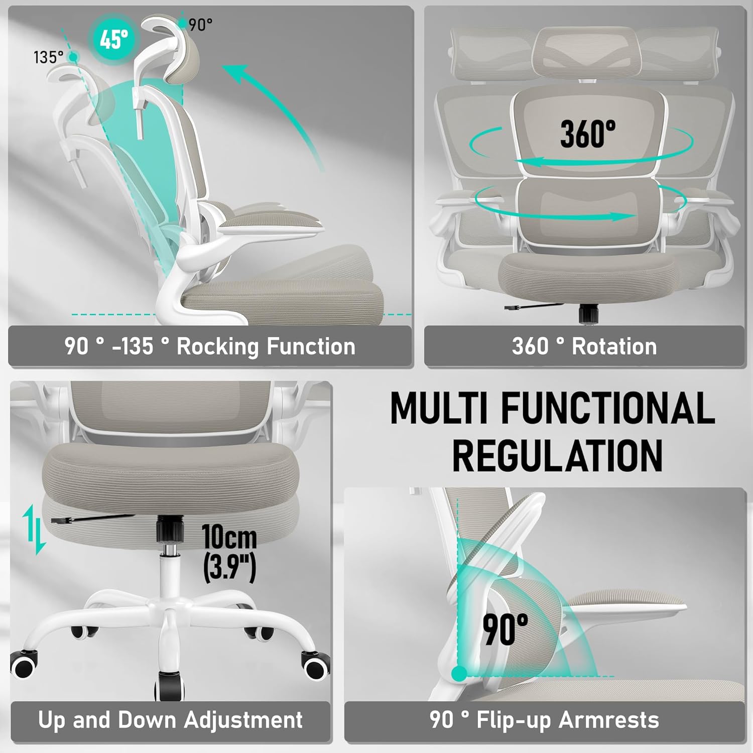 - 【Space-Saving Flip-Up Armrests】Designed with flip-up armrests, this office chair allows you to easily fold the padded arms up to 90° for space-saving convenience. Push the desk chair under your desk to free up valuable floor space. This versatile chair is ideal for use in home offices, meeting rooms, and gaming setups, with a stylish Light Gray color that suits any environment.