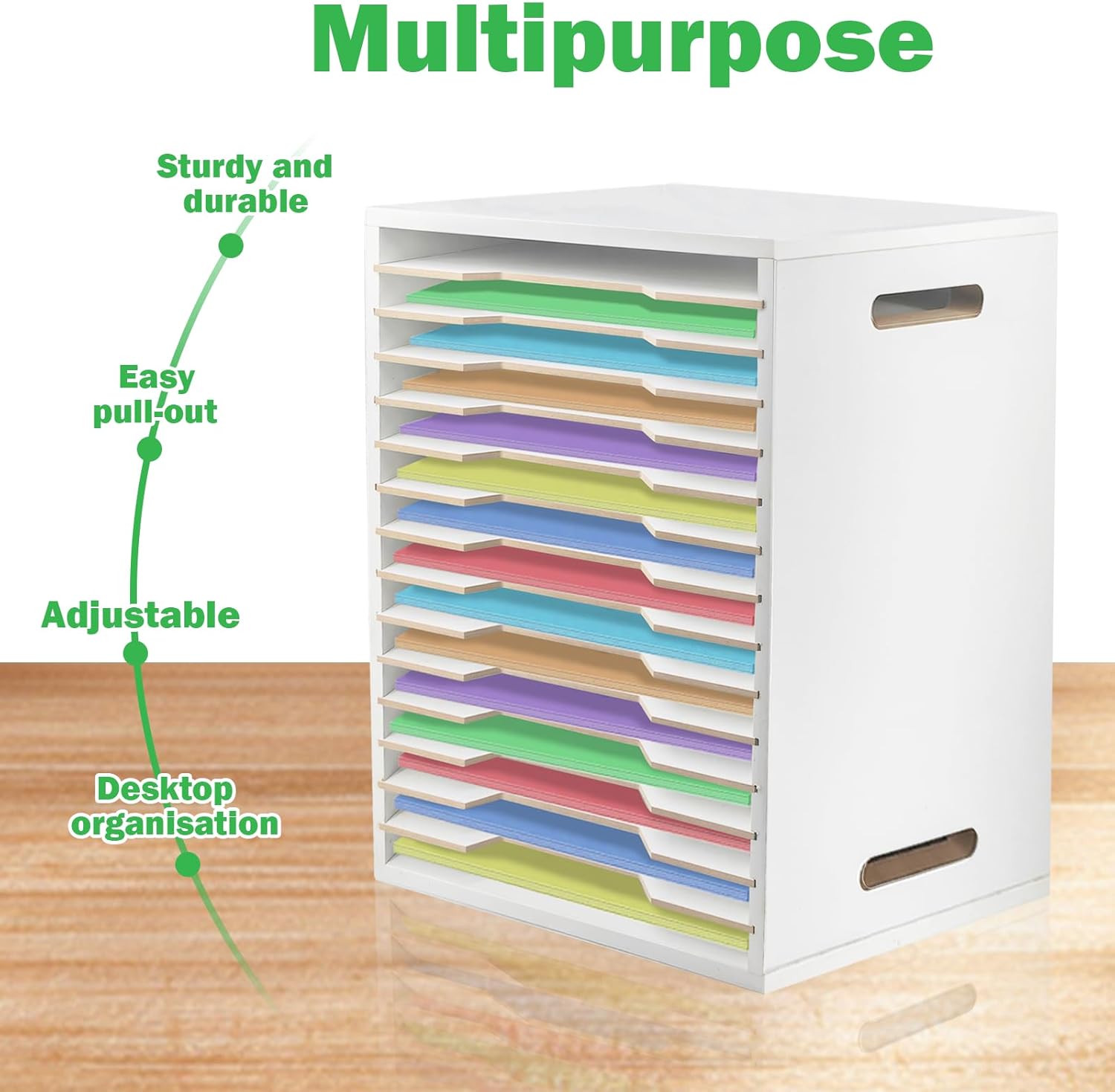 - Versatility: With 15 tiers of storage and each 1 inches height, Use the wood construction paper organizer, to efficiently organize supplies, documents, construction paper, scrapbooking paper, printing paper, adhesive craft paper, file folder, magazines, calculators, notebooks etc.