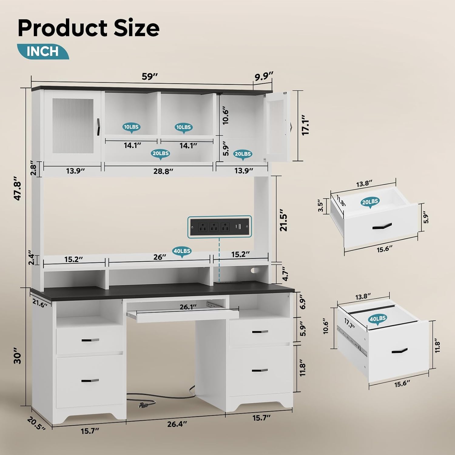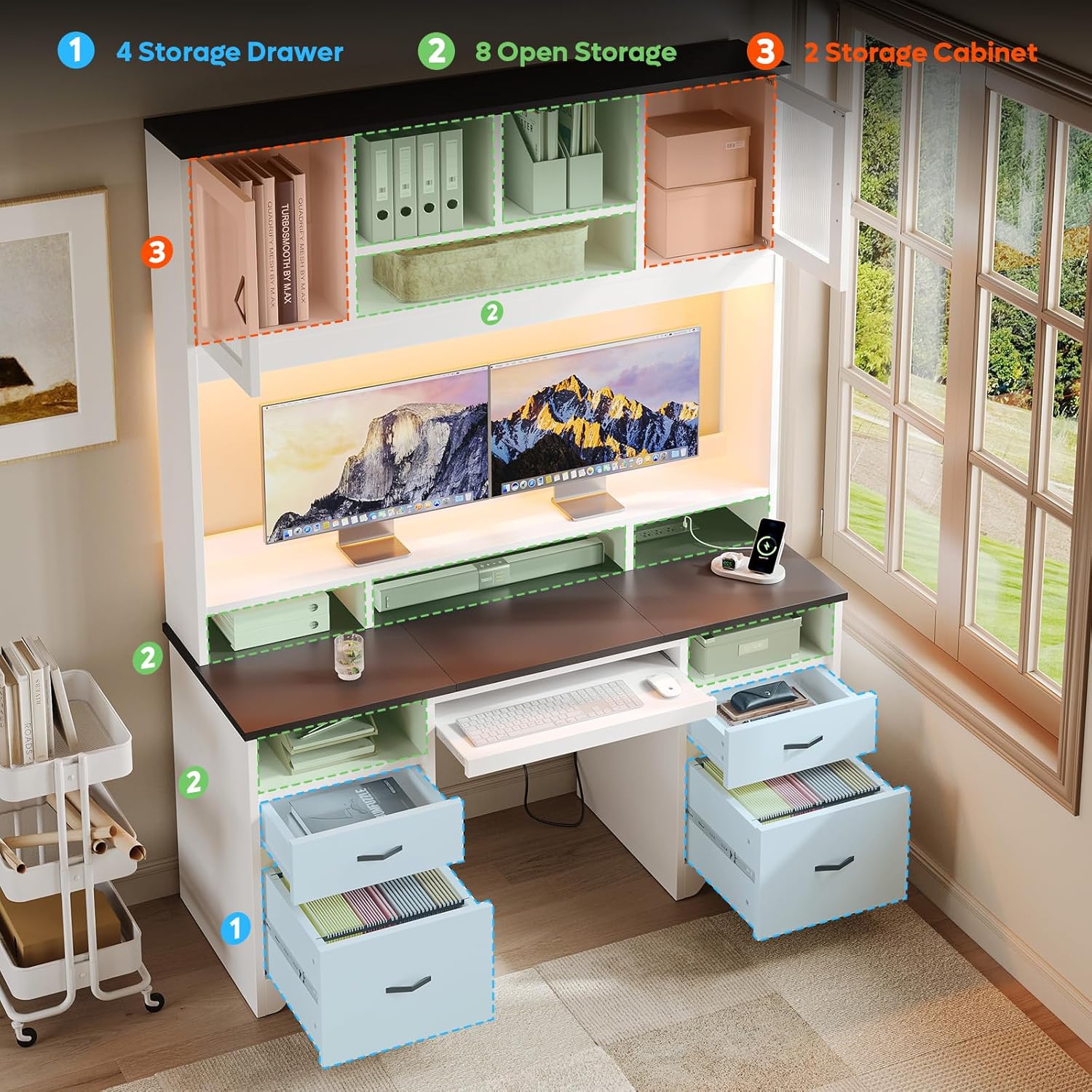 Bestier 77.8" H Executive Desk with Hutch, Modern Wood Computer Desk with Drawers, Charging Station, LED Light, Fluted Storage Cabinet, Keyboard Tray, 59" W Office Desk for Home Office, White