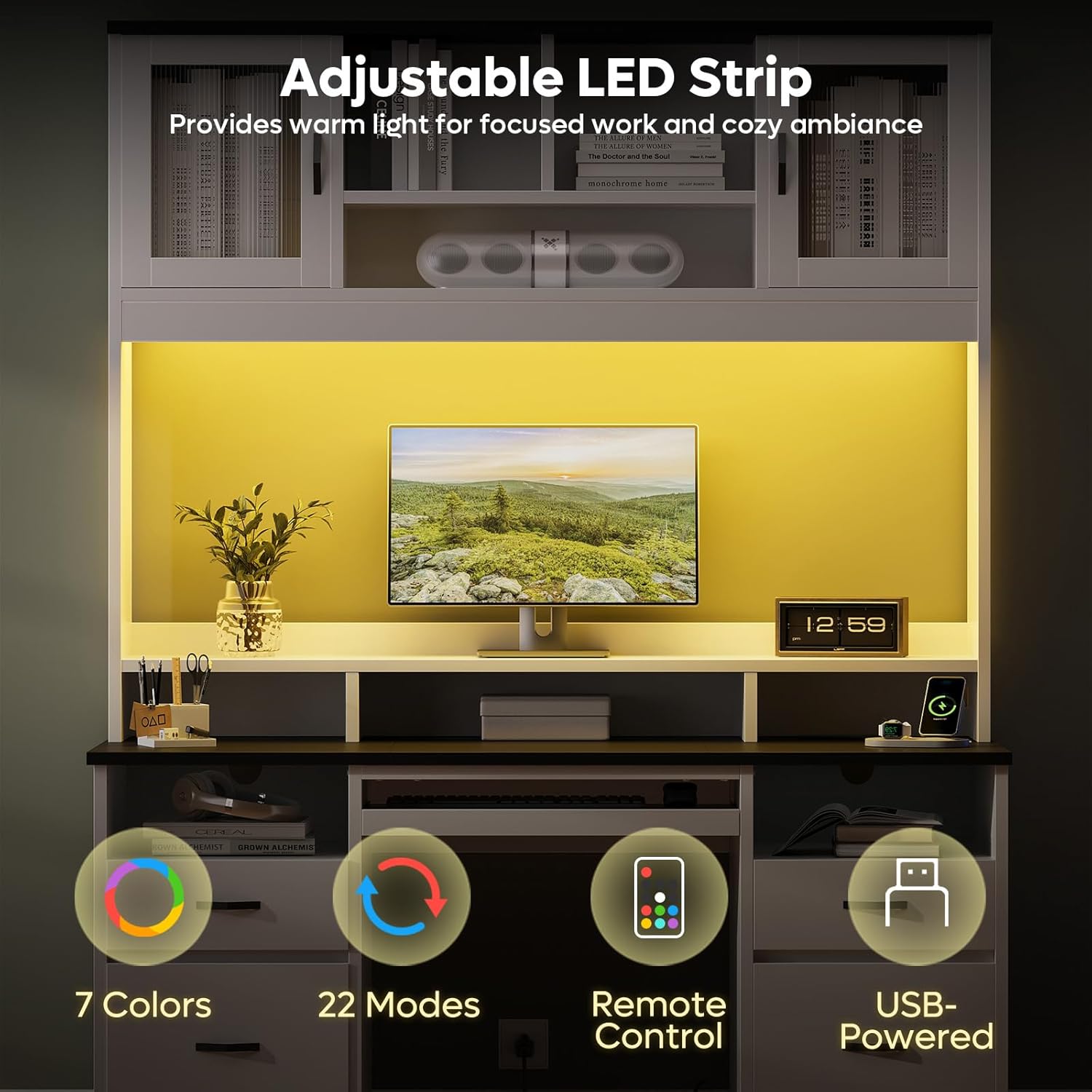 - Adjustable LED Lighting System: Choose from 7 colors and 22 dynamic modes via remote control. Powered by USB, the built-in LEDs deliver bright task lighting for evening work or set a relaxing ambiance for downtime and gaming