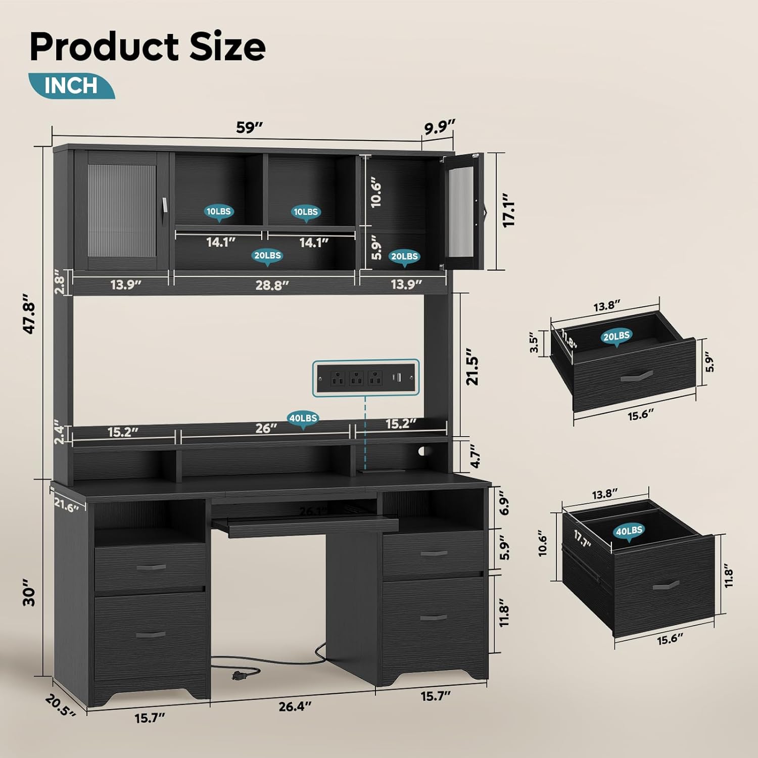 Bestier 77.8" H Executive Desk with Hutch, Modern Wood Computer Desk with Drawers, Charging Station, LED Light, Fluted Storage Cabinet, Keyboard Tray, 59" W Office Desk for Home Office, Black