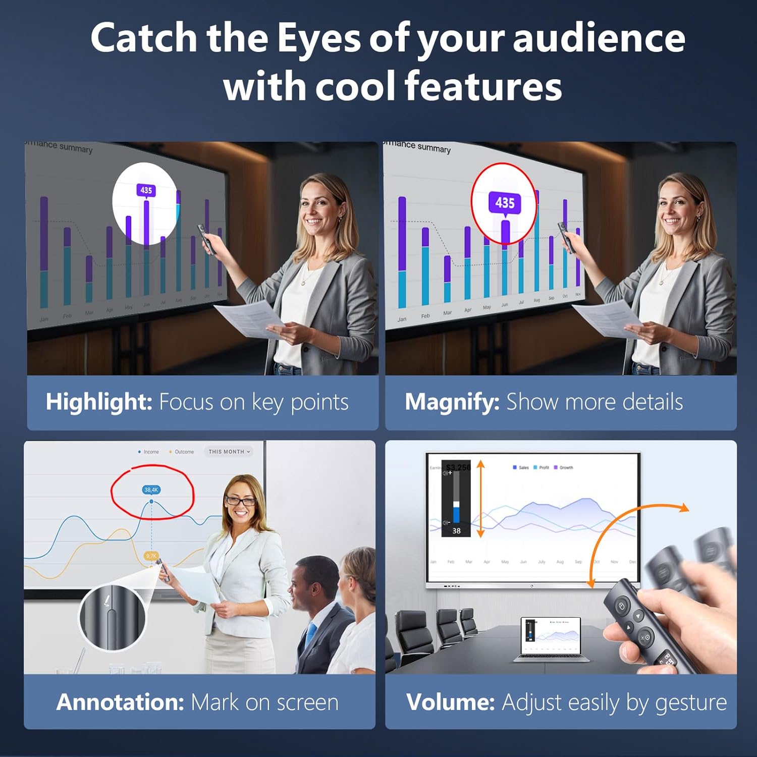 - OLED High-definition Display - Showing the signal strength, remaining power, Clock/Countdown Settings of vibration, Pairing/Connection status. Keep the presenter away from anxiey of power, lossing control of the pace of the presentation etc.