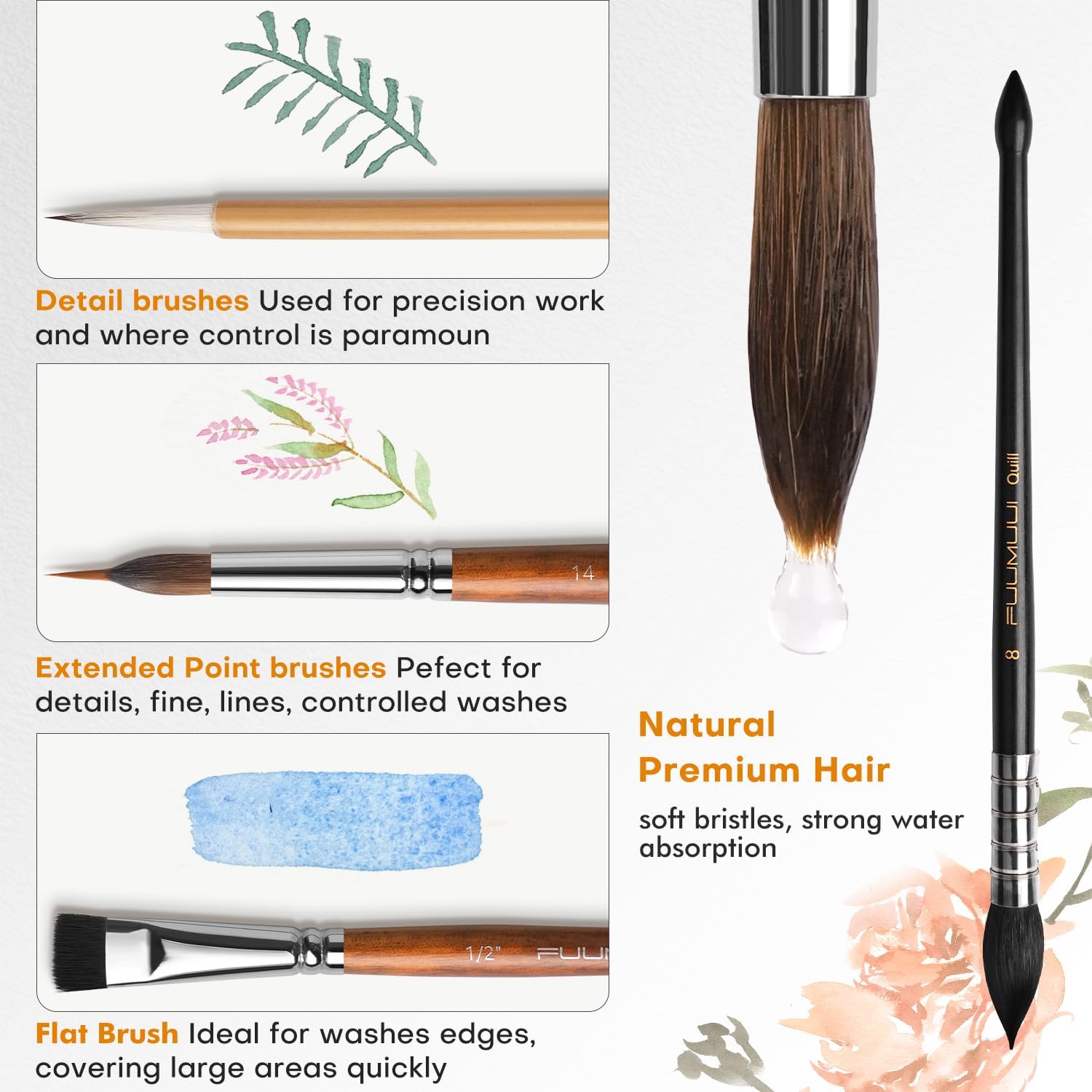 - Professional 5pcs Watercolor Brush Set - Fuumuui's watercolor paint brushes set come in a wide range of shapes ( Extended Needle, Pointed Rounds, Flats, Mop Wash, Writing Brush ) so you can paint from long, thin lines to large areas with ease, watercolors, gouache, tempera, ink, and fluid acrylics—perfect for watercolor paper, sketchbooks, or canvas.