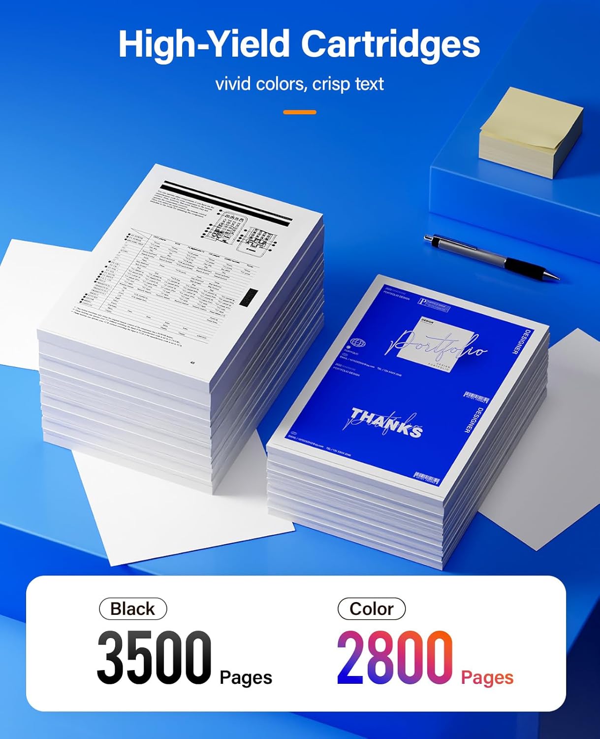 - Page Yield: Up to Black is 3,500 pages per black cartridge and Color is 2,800 Pages per color cartridge (Letter/A4, at 5% Coverage).