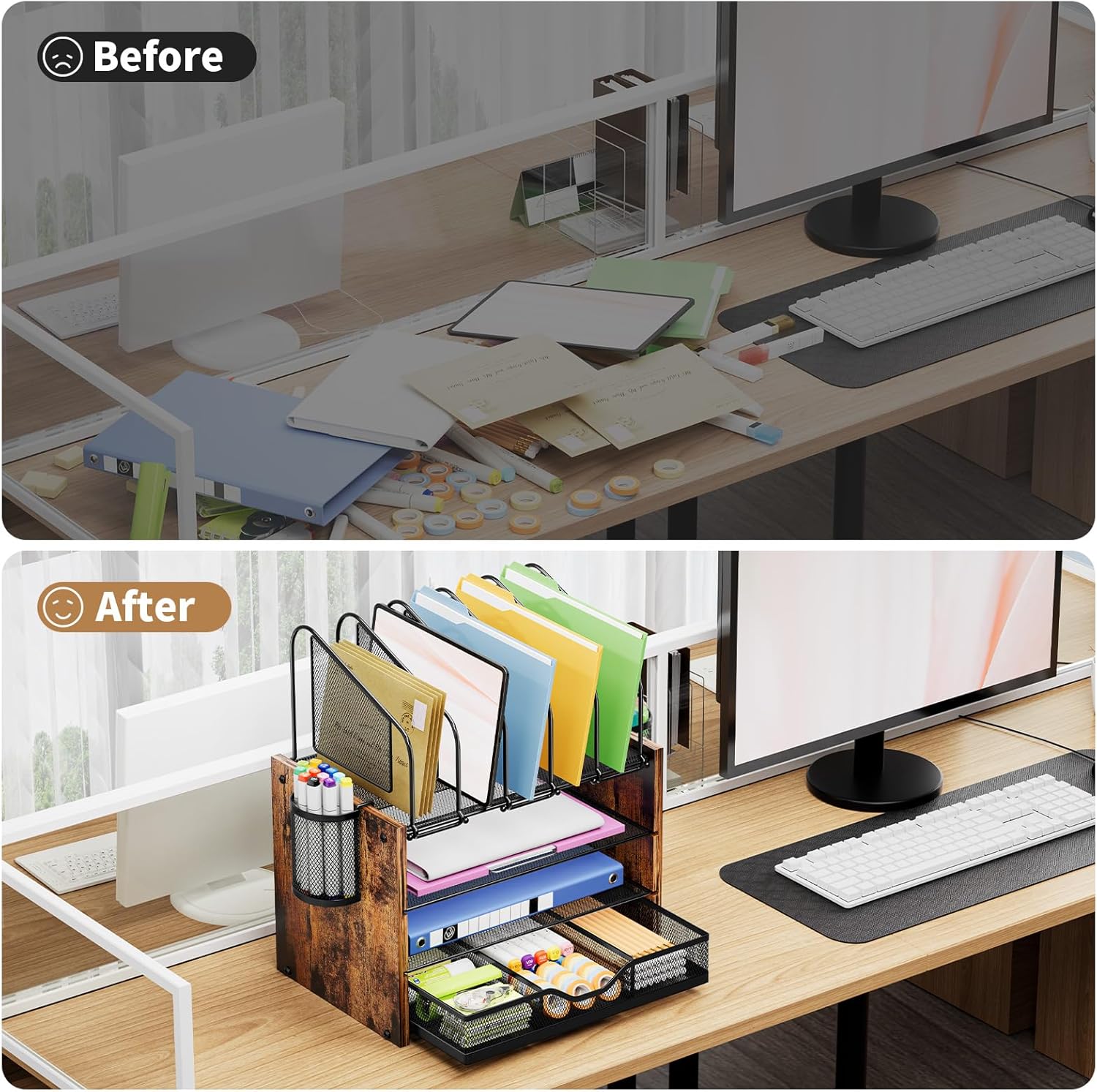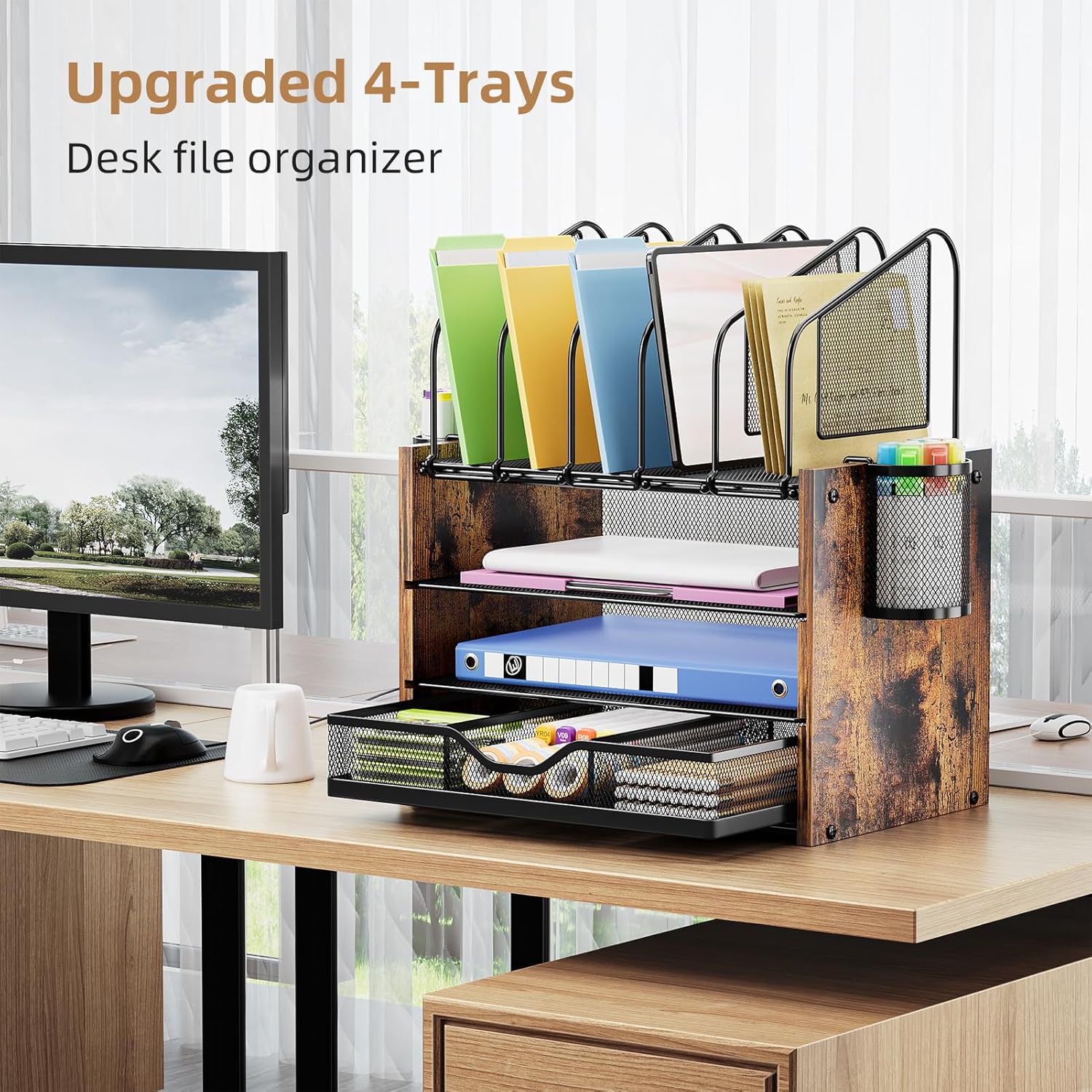 - 【Multifunctional Desk organizer】Our upgrade desktop file organizer has vertical and horizontal storage space – 4 Tiers +5 vertical sorters +3 compartments drawer+ additional 2 pen holders . Upright section has five 2" Compartments for magazines, bill, file, book. Three types of use to meet your various office needs!!