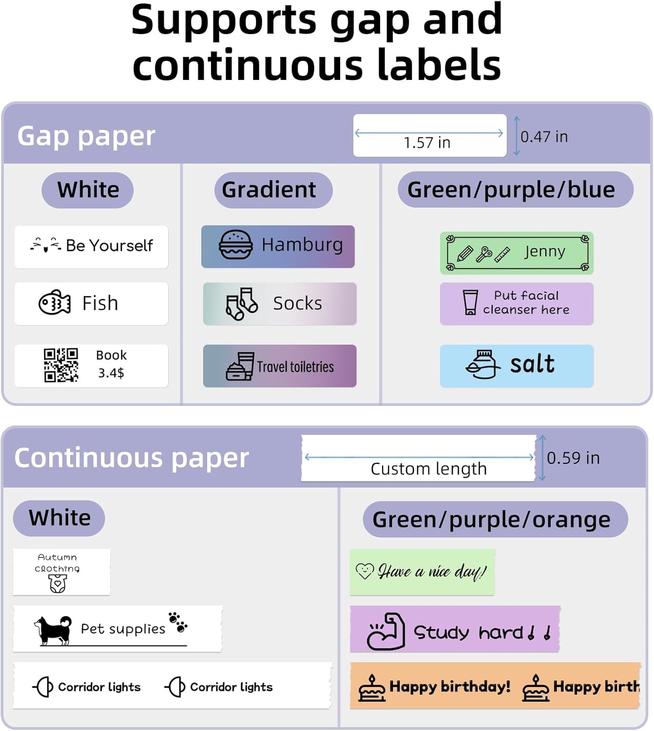 - Multiple Creative Functions: The Snap & Tag app for this Bluetooth label maker provides various features and templates, easily create label stickers with text, QR codes, barcodes, materials, images, time, and borders; Customize label lengths with continuous tape, or use fixed-size labels for batch printing, featuring a built-in cutter for simple label cutting