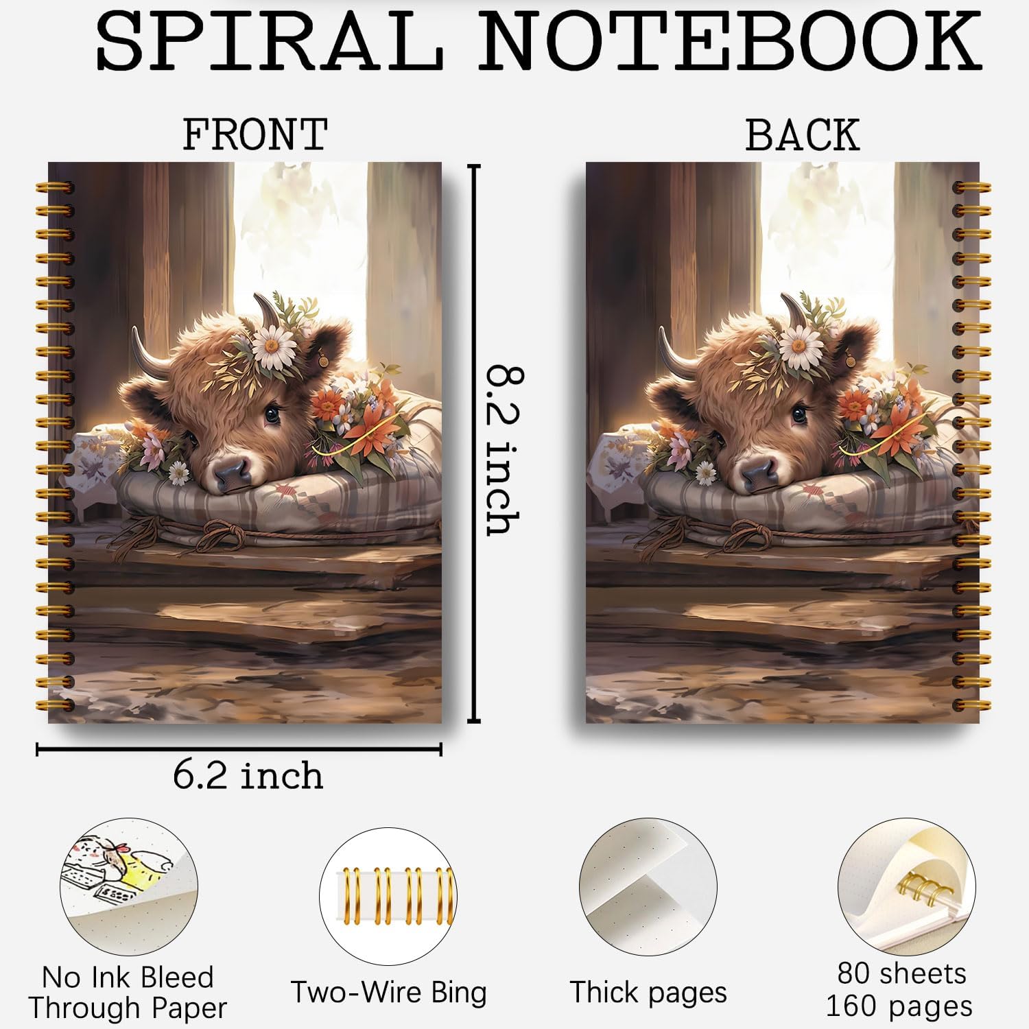 Guymn Highland Cow Notebook, Floral Highland Cow Journal for Writing, Farmhouse Rustic Floral Heifer Hardcover Spiral Notebooks 5.5x8.3 Inch