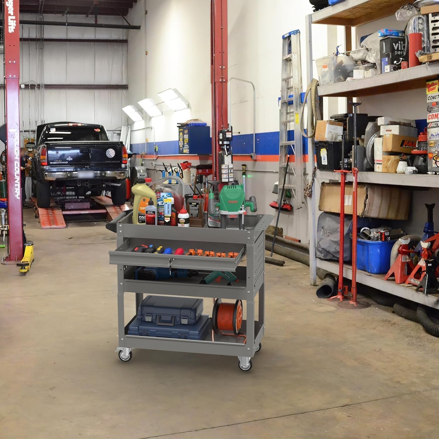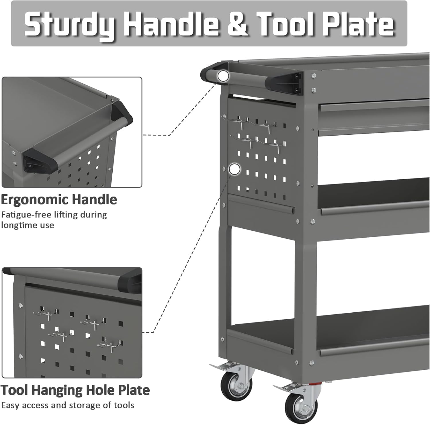 3 Tray Rolling Tool Cart, 400 LBS Capacity Mechanic Tool Carts on Wheels, Heavy Duty Utility Cart with Drawers, Metal Work Cart for Garage, Warehouse and Repair Shop, Grey