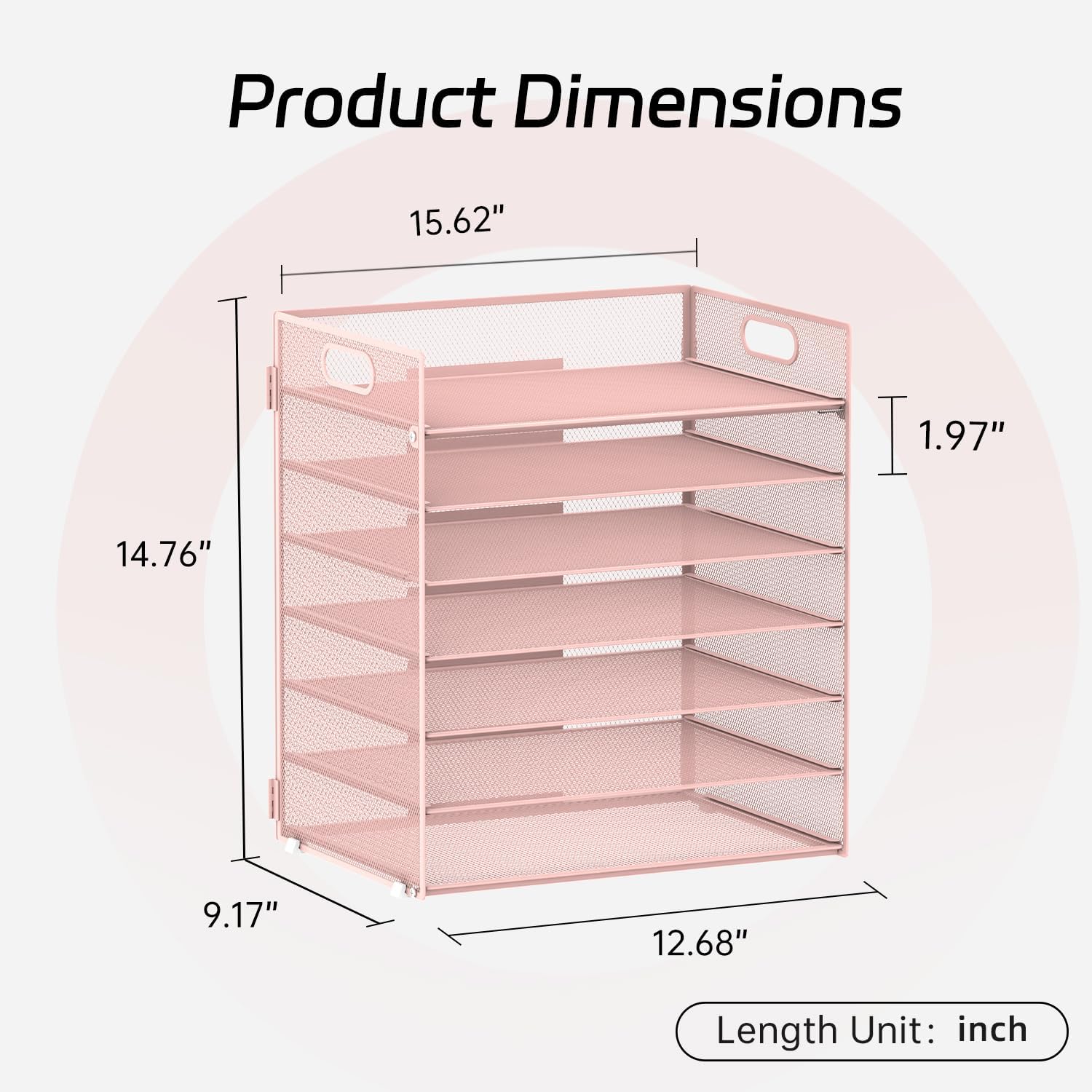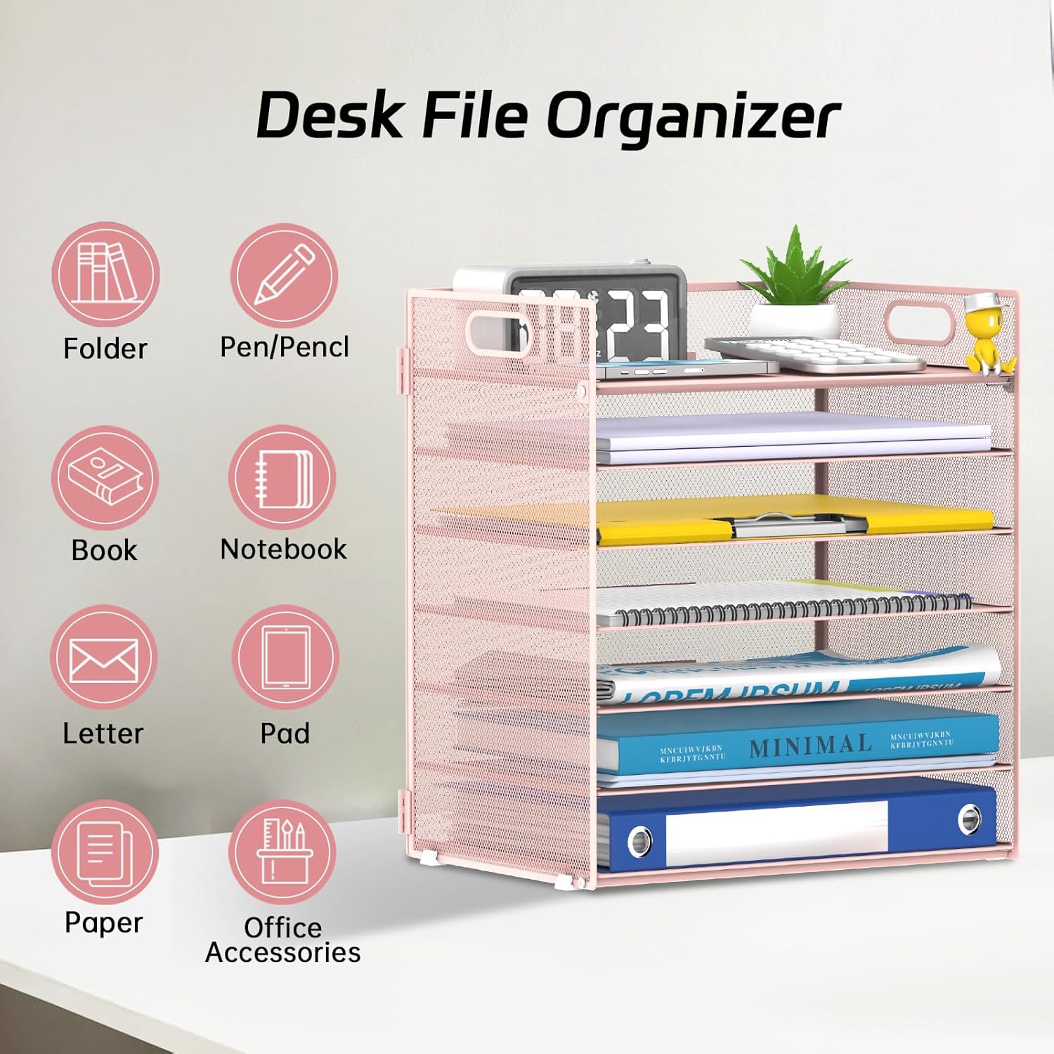 7 Tier Paper Organizer - Mesh Desktop File Holder with Handles for Office School Desk, Black (Pink)