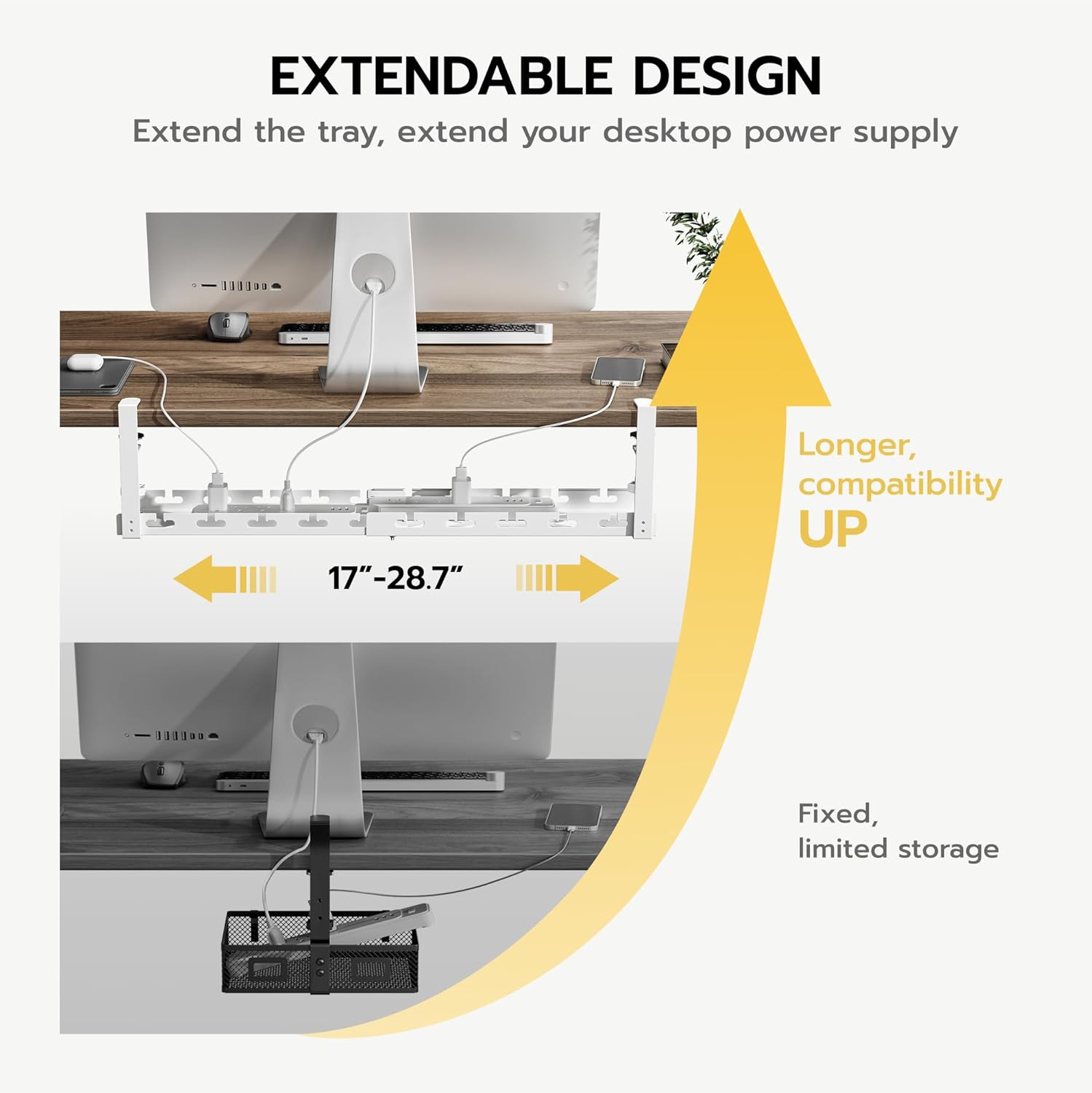 - 【Adjustable Length for Perfect Fit】Say goodbye to messy, tangled cables! With an extendable range from 17" to 28.7", this cable management under desk organizer adapts to desks of all sizes and setups—from compact home offices to large multi-monitor workstations. No need to worry about overhanging ends or awkward gaps—just a seamless, customized fit that keeps everything organized and off the floor.
