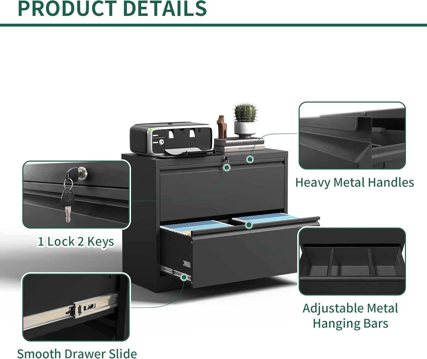 - 【Humanized Design】: The steel ball bearing full extension drawer of the lateral file cabinet slide, high-quality ball bearing glides for easy to open and close the drawers. Experience ultimate convenience with our filing cabinet's humanized design features, allowing you to work without disturbing others and maintaining a peaceful environment.