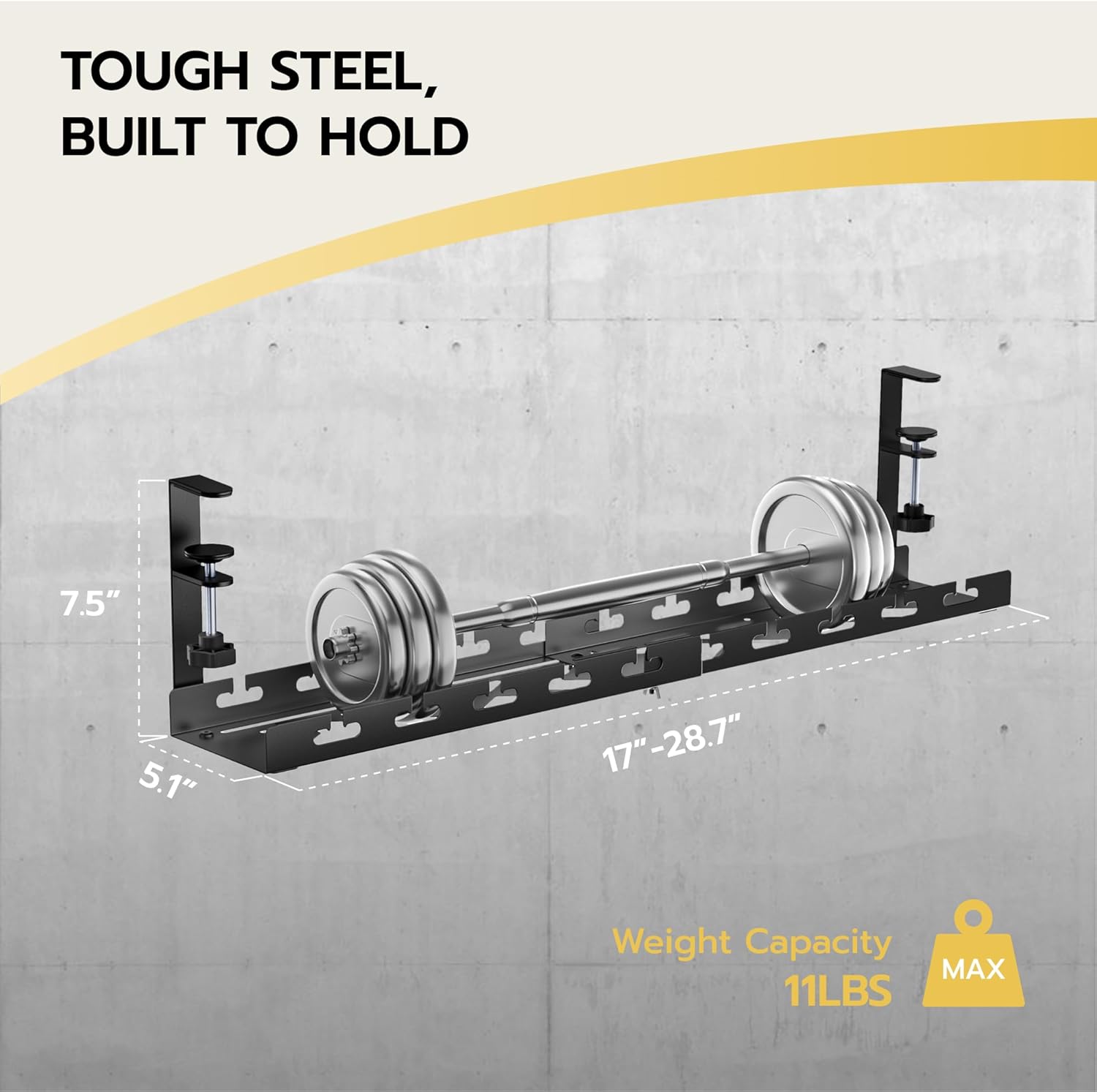 ARES WING 17"-28.7" Extendable Under Desk Cable Management Tray with Cable Slots, Clamp On Cord Organizer Holds Up to 11 lbs, Black Metal Under Desk Storage for Office and Gaming Accessories