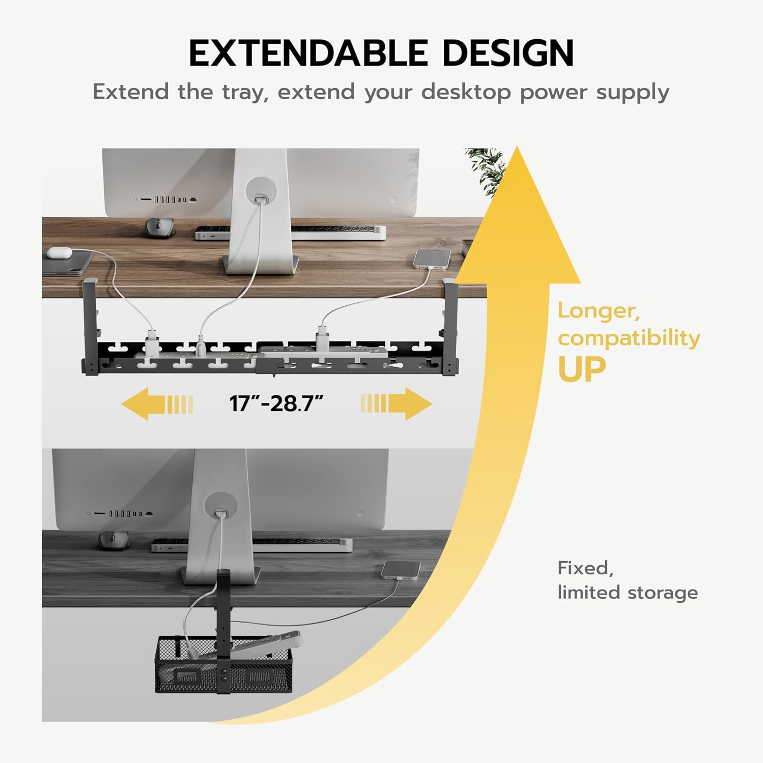 - 【Adjustable Length for Perfect Fit】Say goodbye to messy, tangled cables! With an extendable range from 17" to 28.7", this cable management under desk organizer adapts to desks of all sizes and setups—from compact home offices to large multi-monitor workstations. No need to worry about overhanging ends or awkward gaps—just a seamless, customized fit that keeps everything organized and off the floor.