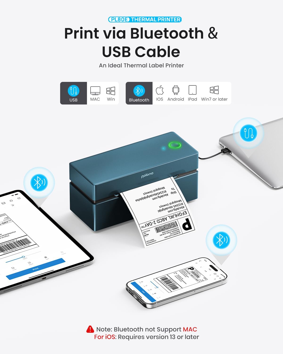 - 2025 New Version: POLONO Bluetooth thermal printer offers faster and clearer printing. The PL80E Bluetooth thermal printer is a high-speed shipping label printer, printing up to 72 labels/min for 4x6-inch labels. This thermal printer works with fanfold and roll labels (0.97"-4.25" width) and delivers 203 dpi high-resolution prints. An ideal choice for shipping and logistics, this shipping label printer ensures efficient, clear results. Note: Monochrome printing only. If nothing prints on 4Γ6 labels, make sure the paper is face up and select 100x150 mm