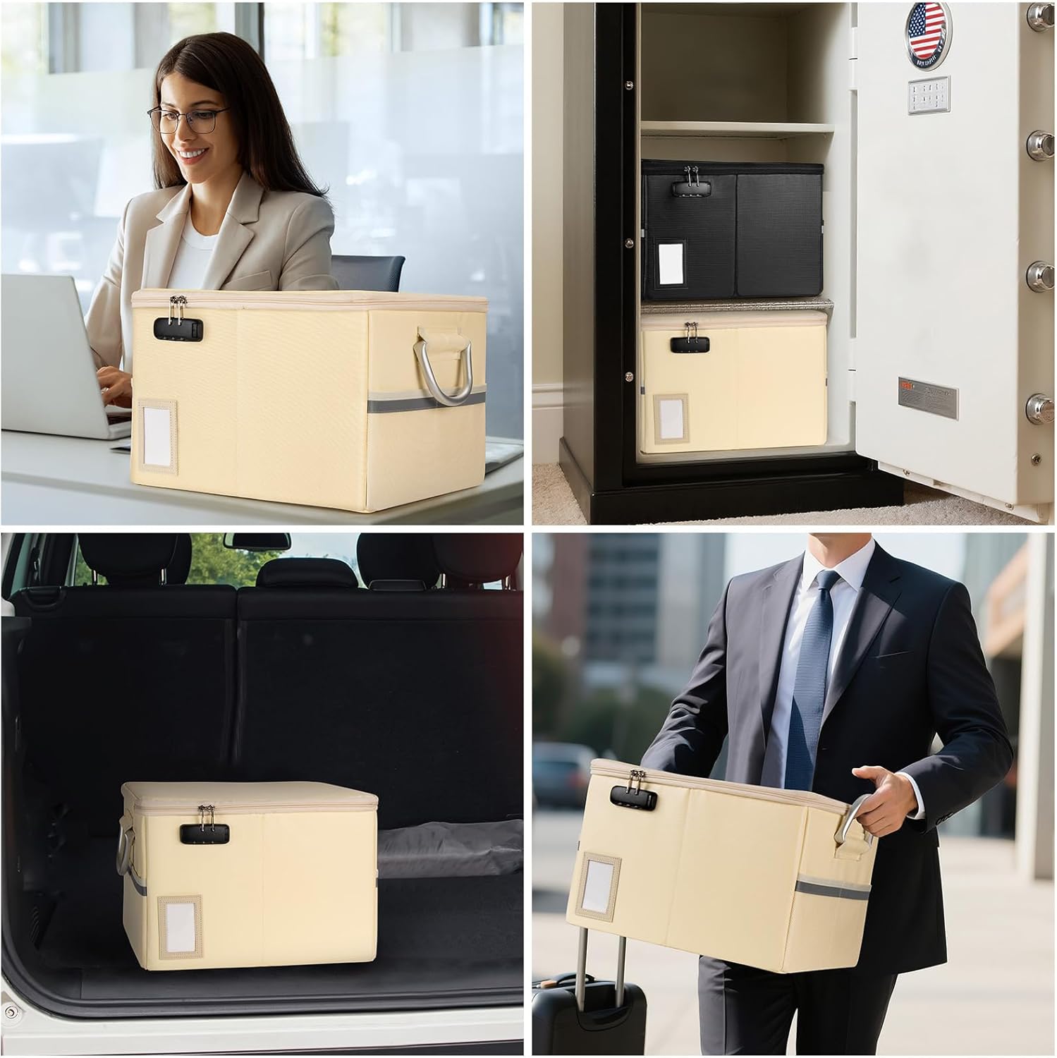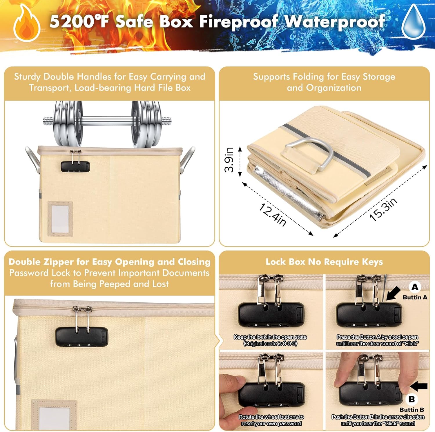 - File Box with Lock: Double zipper file box with code lock enhance storage security and protect your important files from prying eyes and loss, includes instruction manual for combination lock. Fireproof box is designed with handles and reflective strips on the side to lift and transfer. Fireproof box can be accurately located even in the event of a power outage.