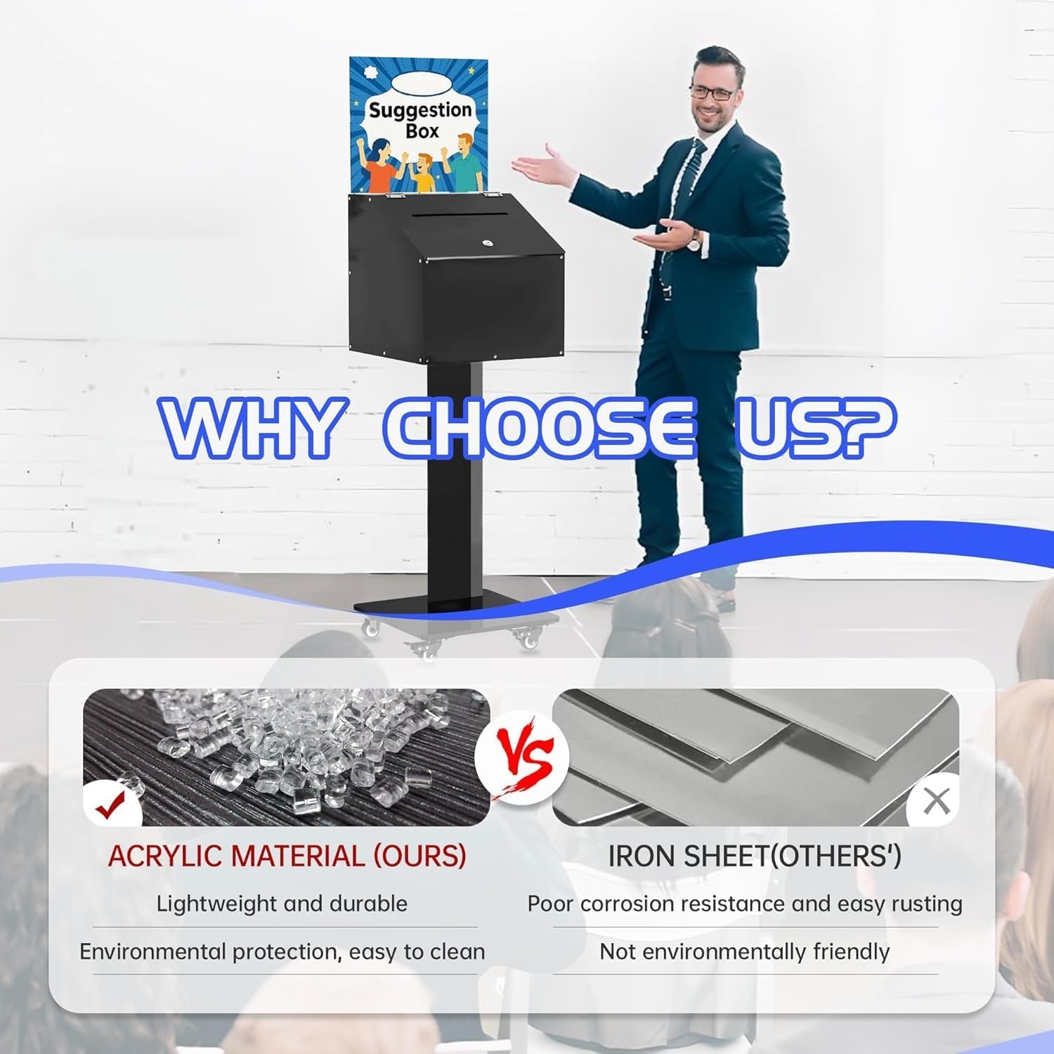 Large-Capacity Acrylic Suggestion Box with Lock & Sign Holder, Floor-Standing Ballot/Donation/Raffle Box on Stand with Wheels, 13.8 in Cube (39.6 in Tall), Black