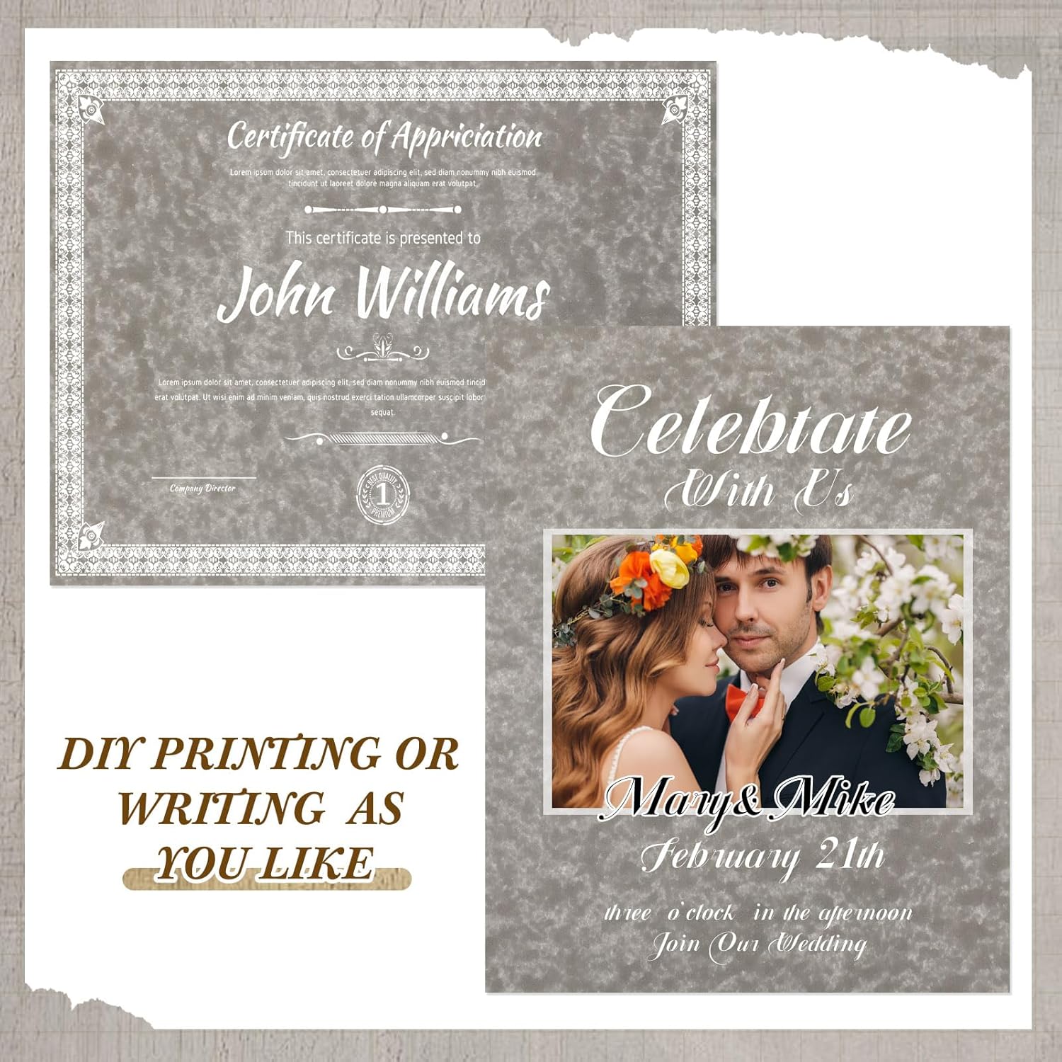 - Work As Different Things: these plain certificate papers are flexible in use, you can use them as certificate printing, wedding invitation, birthday invitation, restaurant menu, theme party decoration and so on, running smoothly in laser and inkjet printers, copiers and offset applications without jams
