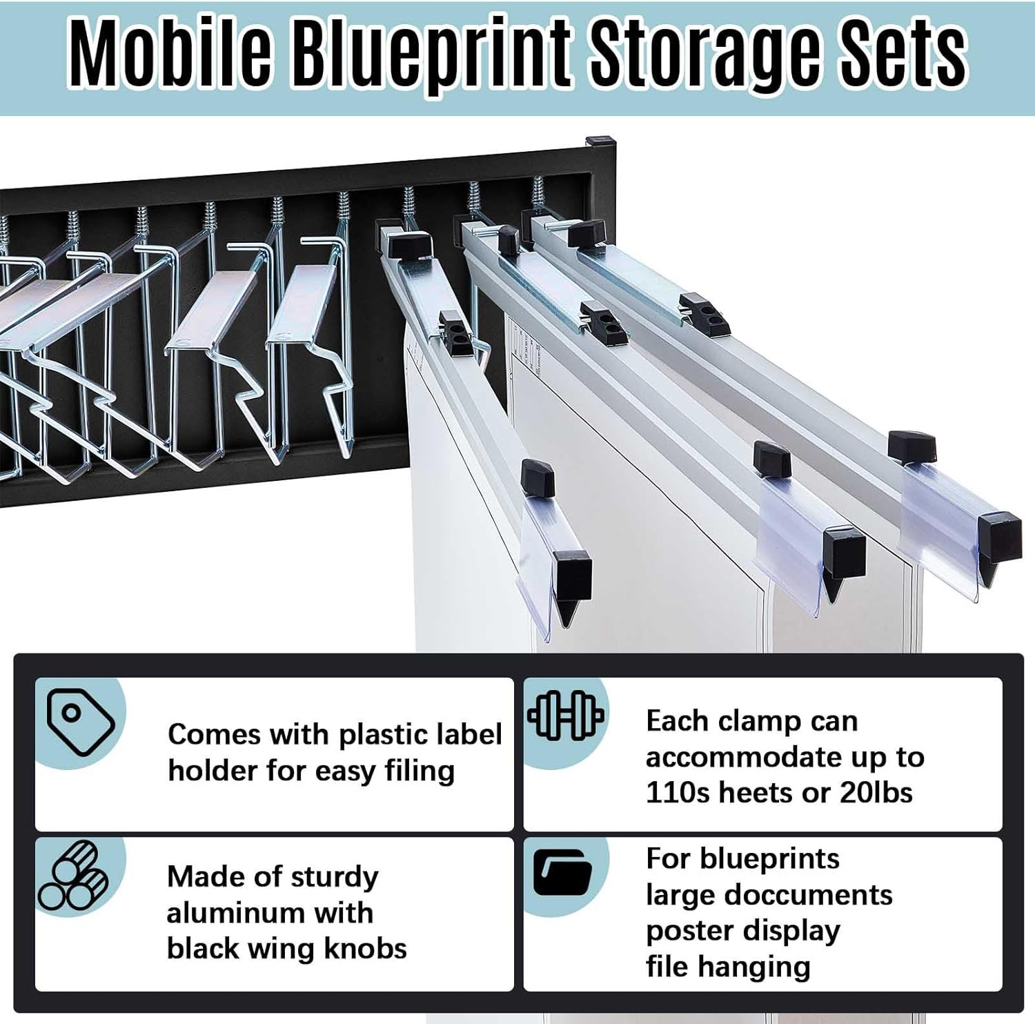 - High Capacity: the blueprint storage rack has been designed for high load capacity; Each hanging clamp can hold up to 100 drawings, this allows for systematic organization of numerous documents; Turn your disordered workplace into a streamlined, well organized space. blue print storage organizer is not limited to storing and displaying blueprints, it can also be used as a poster display stand, architectural drawing storage, map storage and other uses you need